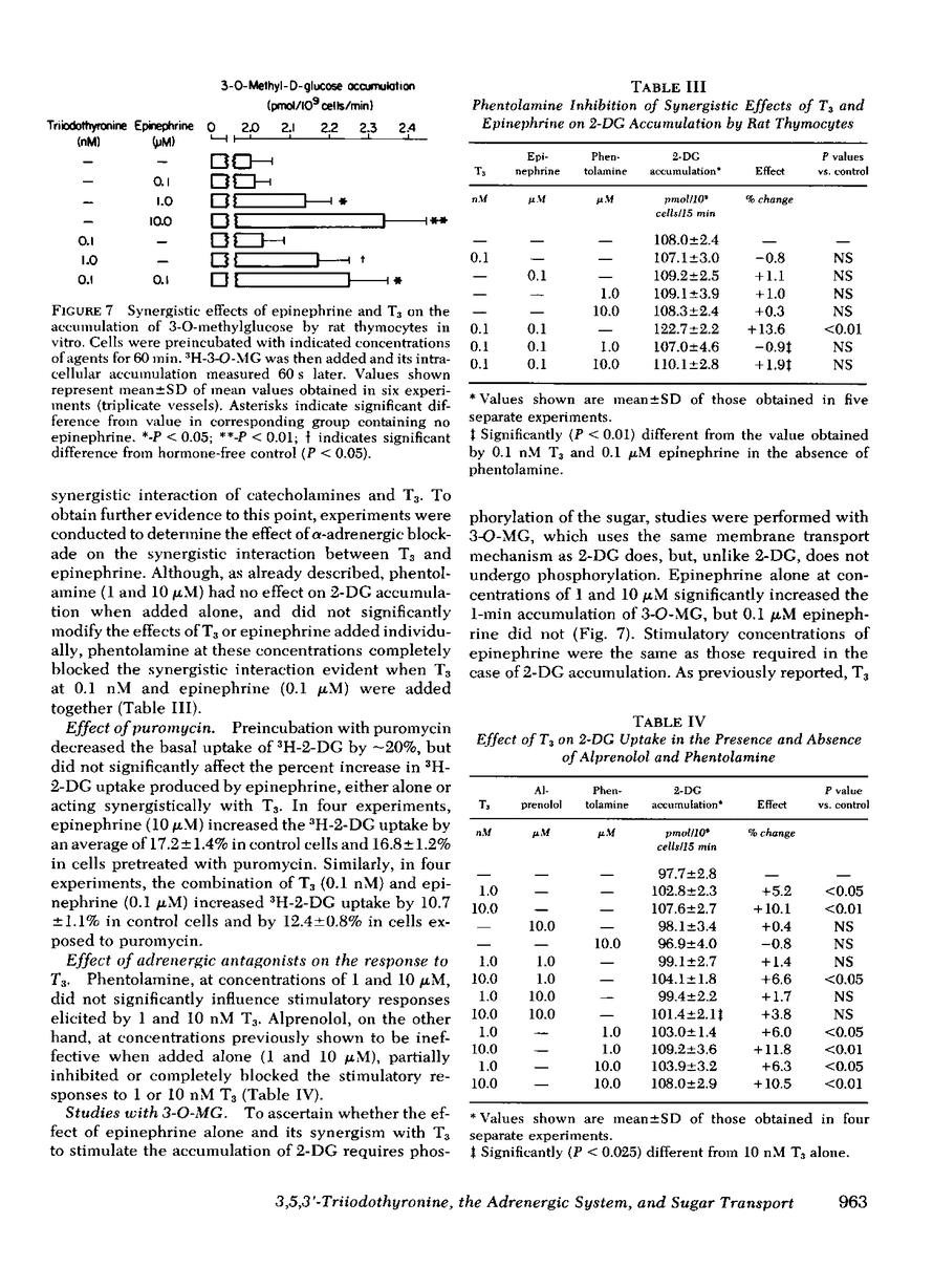 Isolated rat thymocytes were preincubated with various catecholamines, alone and together with 3,5,3′-triiodothyronine (T3), and the accumulation of the glucose analogues, 2-deoxy-d-glucose (2-DG) and 3-O-methylglucose (3-O-MG), was then measured. Epinephrine induced a time- and dose-dependent increase in the 15-min accumulation of 2-DG; at a concentration of 100 μM epinephrine, the effect was evident after a preincubation period of only 5 min. The lowest concentration of epinephrine at which a significant effect was evident was 1 μM. Epinephrine also produced a dose-dependent increase in the accumulation of 3-O-MG, and the lowest concentration at which a significant effect was evident was again 1 μM. Isoproterenol, a β-adrenergic agonist, like epinephrine, increased the accumulation of 2-DG, whereas the α-agonist, phenylephrine, had no effect. The response to epinephrine was inhibited by the β-antagonist, alprenolol, but the α-antagonist, phentolamine, had no effect. As previously demonstrated, T3 increased 2-DG accumulation, and like epinephrine, its effect was blocked by alprenolol. Neither T3 (0.1 nM) nor epinephrine (0.1 μM) had any effect when acting alone, but when added together at these concentrations, they significantly increased the accumulation of both 2-DG and 3-O-MG. Neither T3 with isoproterenol nor T3 with phenylephrine produced a comparable synergistic effect. But T3 (0.1 nM) acting with isoproterenol (0.1 μM) and phenylephrine (0.1 μM) together, synergistically increased 2-DG accumulation. In addition, the α-antagonist, phentolamine, which alone had no effect, inhibited the synergistic effect induced by T3 and epinephrine. The effects of epinephrine and T3 alone, as well as their combined synergistic effect on 2-DG accumulation, were not blocked by the inhibitor of protein synthesis, puromycin.