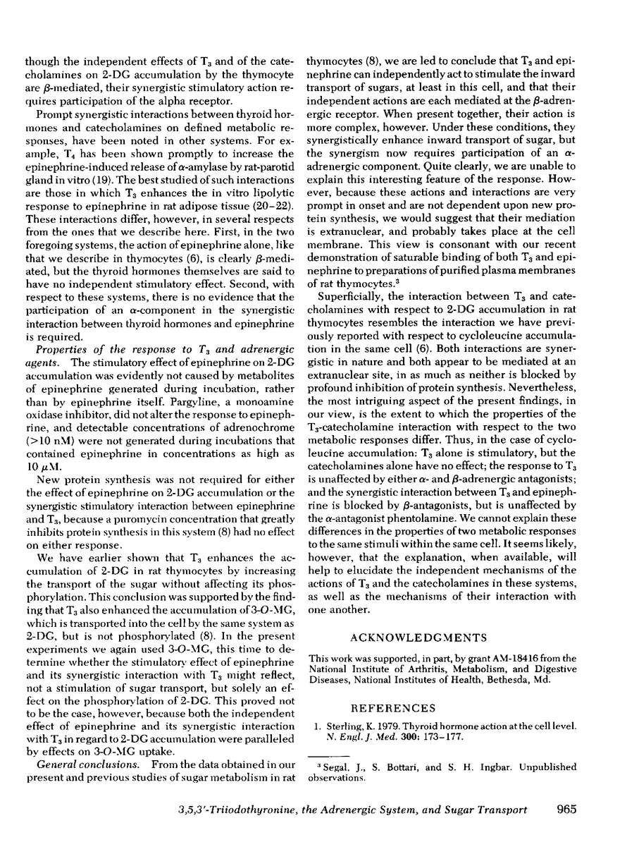 Isolated rat thymocytes were preincubated with various catecholamines, alone and together with 3,5,3′-triiodothyronine (T3), and the accumulation of the glucose analogues, 2-deoxy-d-glucose (2-DG) and 3-O-methylglucose (3-O-MG), was then measured. Epinephrine induced a time- and dose-dependent increase in the 15-min accumulation of 2-DG; at a concentration of 100 μM epinephrine, the effect was evident after a preincubation period of only 5 min. The lowest concentration of epinephrine at which a significant effect was evident was 1 μM. Epinephrine also produced a dose-dependent increase in the accumulation of 3-O-MG, and the lowest concentration at which a significant effect was evident was again 1 μM. Isoproterenol, a β-adrenergic agonist, like epinephrine, increased the accumulation of 2-DG, whereas the α-agonist, phenylephrine, had no effect. The response to epinephrine was inhibited by the β-antagonist, alprenolol, but the α-antagonist, phentolamine, had no effect. As previously demonstrated, T3 increased 2-DG accumulation, and like epinephrine, its effect was blocked by alprenolol. Neither T3 (0.1 nM) nor epinephrine (0.1 μM) had any effect when acting alone, but when added together at these concentrations, they significantly increased the accumulation of both 2-DG and 3-O-MG. Neither T3 with isoproterenol nor T3 with phenylephrine produced a comparable synergistic effect. But T3 (0.1 nM) acting with isoproterenol (0.1 μM) and phenylephrine (0.1 μM) together, synergistically increased 2-DG accumulation. In addition, the α-antagonist, phentolamine, which alone had no effect, inhibited the synergistic effect induced by T3 and epinephrine. The effects of epinephrine and T3 alone, as well as their combined synergistic effect on 2-DG accumulation, were not blocked by the inhibitor of protein synthesis, puromycin.