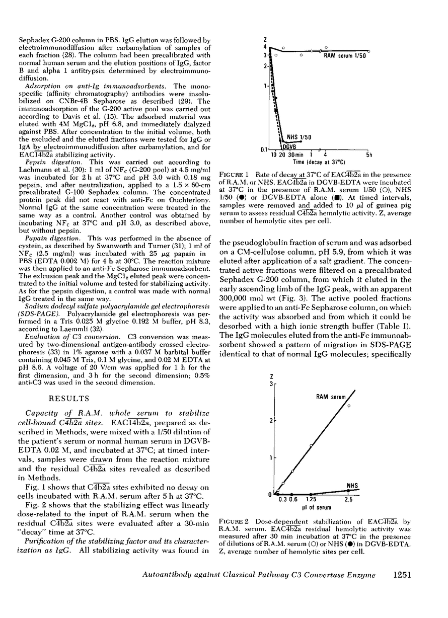 A factor, functionally characterized by its capacity to stabilize the normally labile classical pathway C3-converting complex of the classical pathway of complement, has been isolated from the serum of one patient with a case of acute glomerulonephritis, subsequent to a cutaneous infection. The factor confers long-lived stabilization of classical pathway C3 convertase complexes formed both in the solid (sensitized sheep erythrocytes bearing activated C̄1̄ and the classical pathway C3 convertase) and fluid phase. The half-life of such stabilized C3-cleaving enzymes extended beyond several hours at 37°C. The stabilizing activity was associated with a protein fraction immunochemically identified as immunoglobulin (Ig)G, a sizeable population of which exhibited a gamma chain of 60,000 daltons. The IgG-associated stabilizing activity was found to bind to the classical pathway C3 convertase enzyme via a fragment bearing the antigen-binding site of the molecule [F(ab)2 and F(ab)]. Such binding was demonstrable for classical pathway and not for alternative pathway C3 convertase. Thus, the stabilizing factor behaves like an autoantibody to the C3-converting complex of the classical pathway of complement. The binding of the antibody to the enzyme affords protection of the latter against decay-degradation. By analogy with the nephritic factor of the alternative pathway situation where IgG autoantibodies specifically bind to alternative pathway C3 convertase enzymes and protect them from degradation, the functionally unusual IgG in our patient was designated as the nephritic factor of the classical pathway. Indirect evidence suggests that nephritic factor of the classical pathway-IgG might be of the IgG3 subclass.