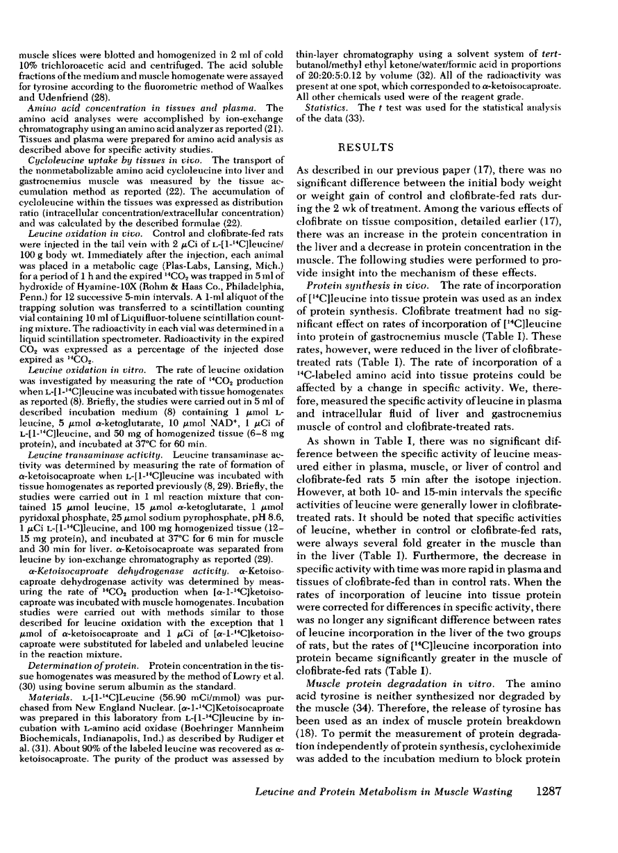 Treatment of hyperlipidemia with clofibrate may result in development of a muscular syndrome. Our previous investigation (1979. J. Clin. Invest.64: 405.) showed that chronic administration of clofibrate to rats causes myotonia and decreases glucose and fatty acid oxidation and total protein of skeletal muscle. In the present experiments we have investigated amino acid and protein metabolism in these rats. Clofibrate administration decreased the concentration of all three branched-chain amino acids without affecting those of others in muscle. Studies to examine the mechanism of decreases in muscle concentrations of branched-chain amino acids showed the following: (a) Plasma concentration of leucine was decreased, whereas there was no significant change in the concentration of isoleucine and valine. (b) Liver concentrations of all three branched-chain amino acids remained unaltered. (c) The uptake of cycloleucine (a nonmetabolizable analogue of leucine) by both muscle and liver was unaffected. (d) The percentage of a trace amount of injected [1-14C]leucine expired as 14CO2 in 1 h was significantly increased. (e) The capacity of muscle homogenate for α-decarboxylation of leucine was enhanced, whereas that of liver was unaffected. (f) The activity of leucine transaminase was unaffected, whereas that of α-ketoisocaproate dehydrogenase was increased in muscle.