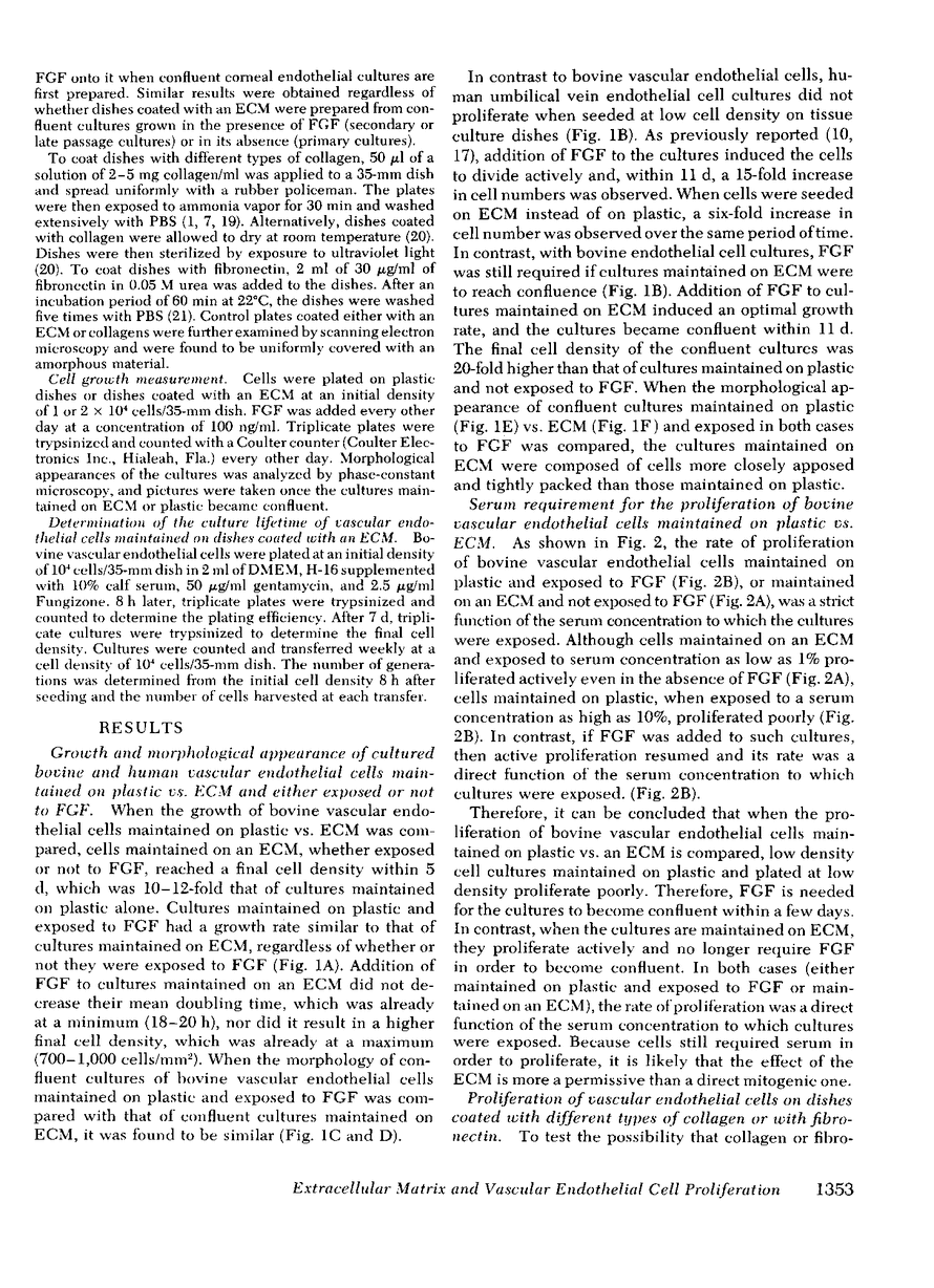 Bovine vascular endothelial cells plated at low cell density in the presence of high (10%) concentrations of serum and maintained on plastic tissue culture dishes proliferate slowly. If the cultures were exposed to fibroblast growth factors (FGF), the cells proliferated actively and, after a week, a monolayer composed of closely apposed and highly contact-inhibited mononucleated cells formed. In contrast to cultures maintained on plastic, cultures maintained on dishes coated with an extracellular matrix produced by corneal endothelial cells proliferated rapidly and no longer required FGF to reach confluence. Addition of FGF to such cultures did not decrease the mean doubling time, which was already at a minimum (18 h), nor did it result in a higher final cell density, which was already at a maximum (700-1,000 cells/mm2). Likewise, although human umbilical vein endothelial cells plated at low density on plastic did not proliferate, they proliferated rapidly when plated on dishes coated with an extracellular matrix. However, unlike bovine vascular endothelial cells, they still required FGF if the cultures were to become confluent.