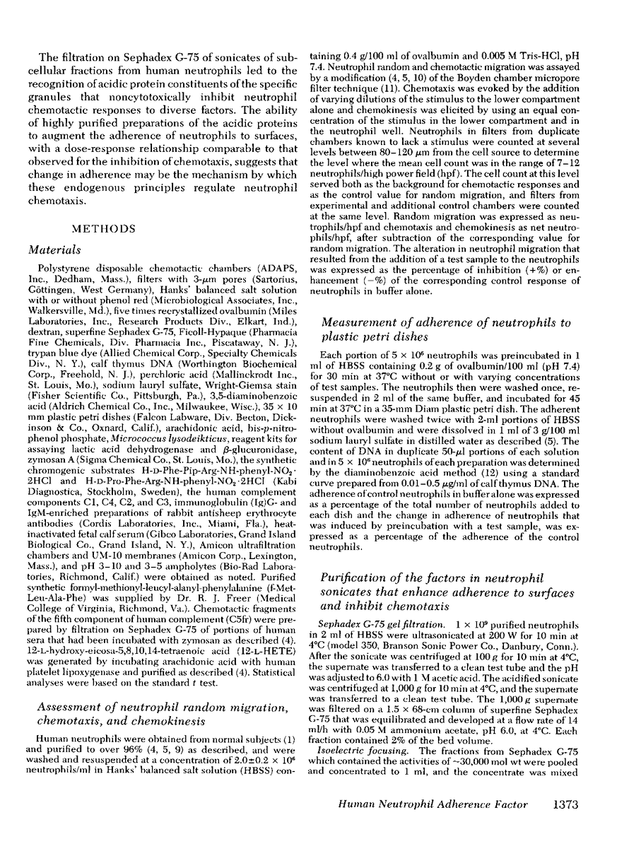 The endogenous constituents of human neutrophils that enhance the adherence of the neutrophils to surfaces have been isolated from sonicates of purified neutrophils. The predominant adherence-enhancing activity in the neutrophil sonicates cofiltered on Sephadex G-75 with a major peak of chemotactic inhibitory activity and exhibited ∼30,000 mol wt. Sequential isoelectric focusing and electrophoresis in glycerol gradients of the 30,000-mol wt activities resolved two distinct acidic protein with isoelectric points of 3.6-3.8 and 3.3-3.4 that were designated the neutrophil adherence factor (NAF) I and II, respectively. Glutamic acid and aspartic acid together accounted for a total of 18 and 19% of the amino acids in purified preparations of NAF I and NAF II, respectively, whereas the basic amino acids lysine, arginine, and histidine represented <2 and 3% of the total residues. The preincubation of portions of 2 × 106 neutrophils with as little as 6 pmol of NAF I or 9 pmol of NAF II enhanced adherence to plastic petri dishes and inhibited chemotactic migration to a maximal extent, with comparable dose-response relationships for the two effects. Neither of the NAF was cytotoxic, exhibited substantial neutrophil chemotactic or chemokinetic activity, or influenced the phagocytosis of sheep erythrocytes sensitized with immunoglobulin (Ig)G. Analyses of subcellular fractions of neutrophils indicated that the NAF are contained predominantly in the specific granules. These distinctive acidic proteins of the specific granules of human neutrophils represent a new class of endogenous constituents that may regulate the involvement of neutrophils in inflammation.