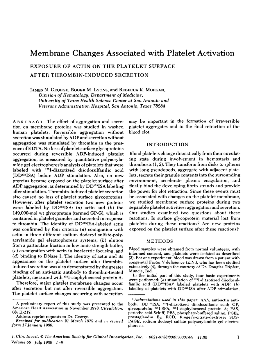 The effect of aggregation and secretion on membrane proteins was studied in washed human platelets. Reversible aggregation without secretion was stimulated by ADP and secretion without aggregation was stimulated by thrombin in the presence of EDTA. No loss of platelet surface glycoproteins occurred during reversible ADP-induced platelet aggregation, as measured by quantitative polyacrylamide gel electrophoresis analysis of platelets that were labeled with 125I-diazotized diiodosulfanilic acid (DD125ISA) before ADP stimulation. Also, no new proteins became exposed on the platelet surface after ADP aggregation, as determined by DD125ISA labeling after stimulation. Thrombin-induced platelet secretion also caused no loss of platelet surface glycoproteins. However, after platelet secretion two new proteins were labeled by DD125ISA: (a) actin and (b) the 149,000-mol wt glycoprotein (termed GP-G), which is contained in platelet granules and secreted in response to thrombin. The identity of DD125ISA-labeled actin was confirmed by four criteria: (a) comigration with actin in three different sodium dodecyl sulfate-polyacrylamide gel electrophoresis systems, (b) elution from a particulate fraction in low ionic strength buffer, (c) co-migration with actin in isoelectric focusing, and (d) binding to DNase I. The identity of actin and its appearance on the platelet surface after thrombin-induced secretion was also demonstrated by the greater binding of an anti-actin antibody to thrombin-treated platelets, measured with 125I-staphylococcal protein A.