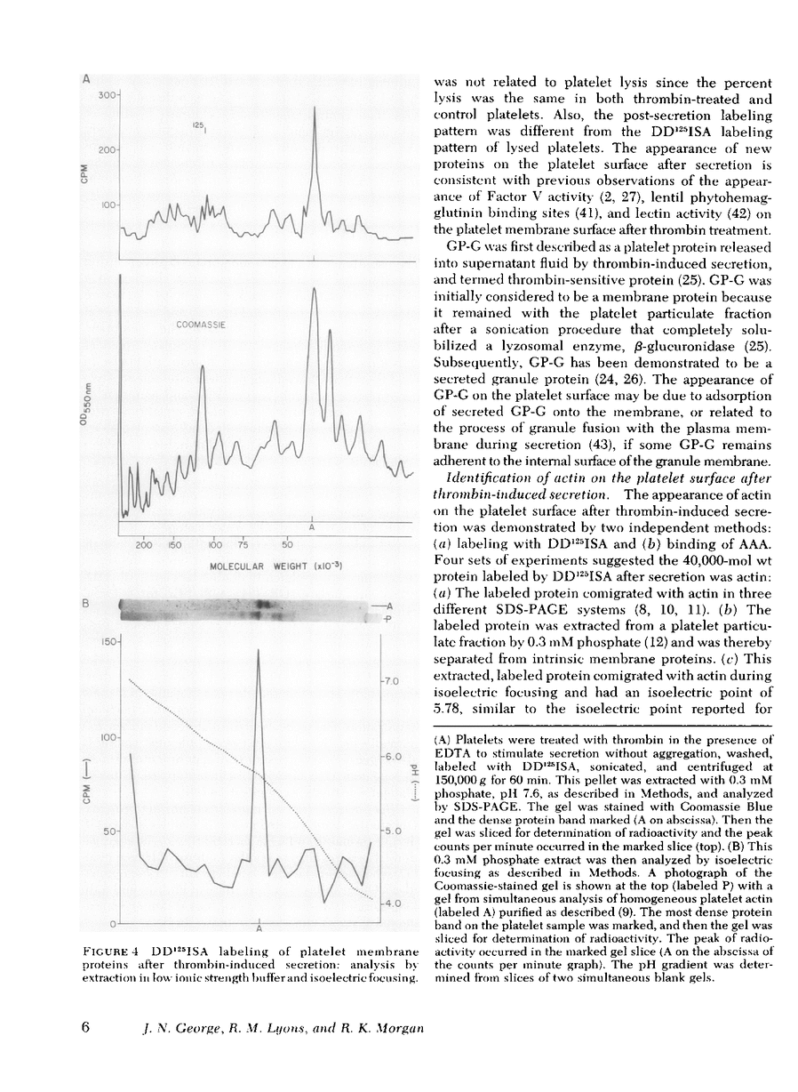 The effect of aggregation and secretion on membrane proteins was studied in washed human platelets. Reversible aggregation without secretion was stimulated by ADP and secretion without aggregation was stimulated by thrombin in the presence of EDTA. No loss of platelet surface glycoproteins occurred during reversible ADP-induced platelet aggregation, as measured by quantitative polyacrylamide gel electrophoresis analysis of platelets that were labeled with 125I-diazotized diiodosulfanilic acid (DD125ISA) before ADP stimulation. Also, no new proteins became exposed on the platelet surface after ADP aggregation, as determined by DD125ISA labeling after stimulation. Thrombin-induced platelet secretion also caused no loss of platelet surface glycoproteins. However, after platelet secretion two new proteins were labeled by DD125ISA: (a) actin and (b) the 149,000-mol wt glycoprotein (termed GP-G), which is contained in platelet granules and secreted in response to thrombin. The identity of DD125ISA-labeled actin was confirmed by four criteria: (a) comigration with actin in three different sodium dodecyl sulfate-polyacrylamide gel electrophoresis systems, (b) elution from a particulate fraction in low ionic strength buffer, (c) co-migration with actin in isoelectric focusing, and (d) binding to DNase I. The identity of actin and its appearance on the platelet surface after thrombin-induced secretion was also demonstrated by the greater binding of an anti-actin antibody to thrombin-treated platelets, measured with 125I-staphylococcal protein A.