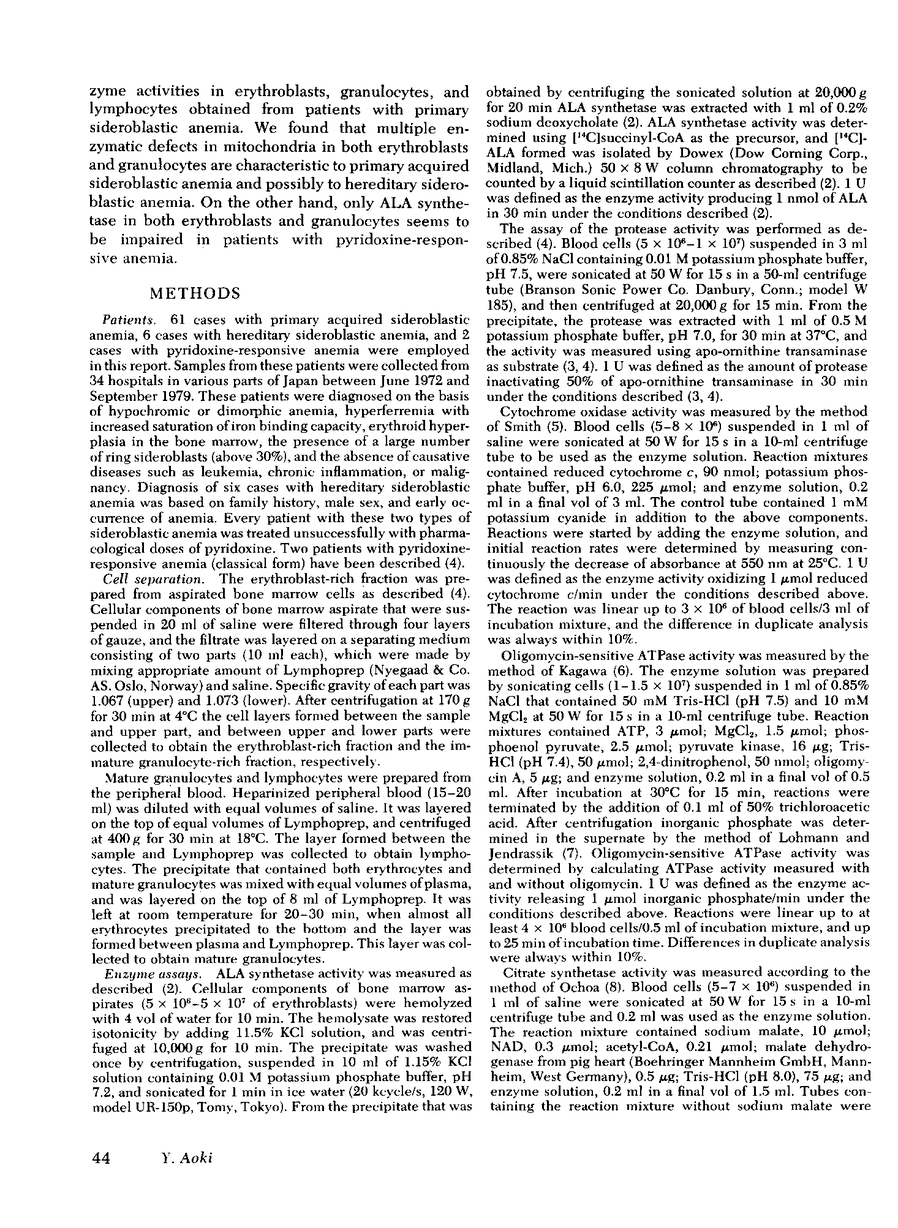 Activities of mitochondrial enzymes in blood cells from 69 patients with primary sideroblastic anemia were determined to elucidate the pathogenesis of the disease. In erythroblasts of patients with primary acquired type the activities of both δ-aminolevulinic acid synthetase and mitochondrial serine protease were inevitably decreased. The susceptibility to the protease of apo-δ-aminolevulinic acid synthetase prepared from erythroblasts of patients with this type was within the normal range, in contrast to that of pyridoxine-responsive anemia. The activities of mitochondrial enzymes such as cytochrome oxidase, serine protease, and oligomycin-sensitive ATPase, except citrate synthetase, were usually decreased in mature granulocytes of the patients. Patients with hereditary sideroblastic anemia also had decreased δ-aminolevulinic acid synthetase activity in erythroblasts, and decreased serine protease activity in both erythroblasts and mature granulocytes. Mature granulocytes obtained from patients with pyridoxine-responsive anemia before therapy had decreased cytochrome oxidase activity, however, the activity increased to a normal level when the patients were in remission. The activities of other mitochondrial enzymes in mature granulocytes were within normal range in these patients before pyridoxine therapy. The activities of these mitochondrial enzymes in lymphocytes were within normal range in all groups of patients with primary sideroblastic anemia.