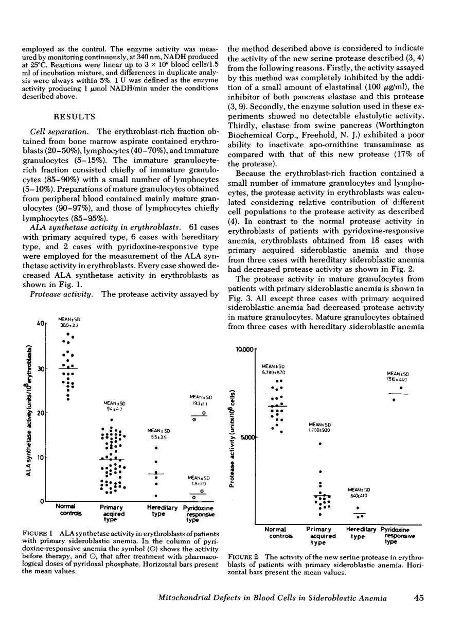 Activities of mitochondrial enzymes in blood cells from 69 patients with primary sideroblastic anemia were determined to elucidate the pathogenesis of the disease. In erythroblasts of patients with primary acquired type the activities of both δ-aminolevulinic acid synthetase and mitochondrial serine protease were inevitably decreased. The susceptibility to the protease of apo-δ-aminolevulinic acid synthetase prepared from erythroblasts of patients with this type was within the normal range, in contrast to that of pyridoxine-responsive anemia. The activities of mitochondrial enzymes such as cytochrome oxidase, serine protease, and oligomycin-sensitive ATPase, except citrate synthetase, were usually decreased in mature granulocytes of the patients. Patients with hereditary sideroblastic anemia also had decreased δ-aminolevulinic acid synthetase activity in erythroblasts, and decreased serine protease activity in both erythroblasts and mature granulocytes. Mature granulocytes obtained from patients with pyridoxine-responsive anemia before therapy had decreased cytochrome oxidase activity, however, the activity increased to a normal level when the patients were in remission. The activities of other mitochondrial enzymes in mature granulocytes were within normal range in these patients before pyridoxine therapy. The activities of these mitochondrial enzymes in lymphocytes were within normal range in all groups of patients with primary sideroblastic anemia.