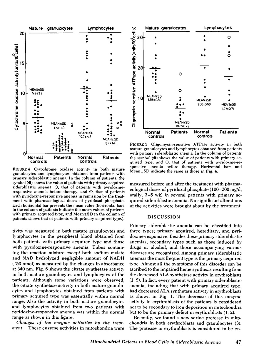 Activities of mitochondrial enzymes in blood cells from 69 patients with primary sideroblastic anemia were determined to elucidate the pathogenesis of the disease. In erythroblasts of patients with primary acquired type the activities of both δ-aminolevulinic acid synthetase and mitochondrial serine protease were inevitably decreased. The susceptibility to the protease of apo-δ-aminolevulinic acid synthetase prepared from erythroblasts of patients with this type was within the normal range, in contrast to that of pyridoxine-responsive anemia. The activities of mitochondrial enzymes such as cytochrome oxidase, serine protease, and oligomycin-sensitive ATPase, except citrate synthetase, were usually decreased in mature granulocytes of the patients. Patients with hereditary sideroblastic anemia also had decreased δ-aminolevulinic acid synthetase activity in erythroblasts, and decreased serine protease activity in both erythroblasts and mature granulocytes. Mature granulocytes obtained from patients with pyridoxine-responsive anemia before therapy had decreased cytochrome oxidase activity, however, the activity increased to a normal level when the patients were in remission. The activities of other mitochondrial enzymes in mature granulocytes were within normal range in these patients before pyridoxine therapy. The activities of these mitochondrial enzymes in lymphocytes were within normal range in all groups of patients with primary sideroblastic anemia.