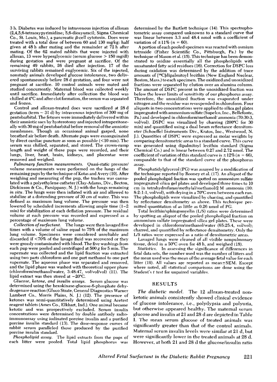 A rabbit model for the diabetic pregnancy was used to investigate the etiology of delayed pulmonary maturation observed in infants of diabetic mothers. Pregnant rabbit does were made glucose intolerant and insulinopenic by injection of alloxan, a pancreatic beta-cell cytotoxin. At 28 d (term approximately 31 d) fetuses of these animals were hyperglycemic, but were not hyperinsulinemic and did not demonstrate tissue overgrowth. Fetal pulmonary maturity was assessed by measurement of pressure-volume relationships on the fetal lungs. Fetuses of glucose-intolerant does demonstrated less retention of air on deflation. Phospholipid components of pulmonary surfactant were assayed on fluid obtained from lavage of the fetal lungs. Levels of disaturated phosphatidylcholine (per-cent total-lavage phospholipids) were diminished in fetuses of glucose-intolerant does compared to control fetuses (20.5 +/- 4.2 vs. 38.0 +/ 4.3%; P less than 0.01). Lecithin/sphingomyelin ratios were similar in both groups and phosphatidylglycerol was not detected in either group. There was a direct correlation between the percentage of alveolar disaturated phosphatidylcholine and retention of air on lung deflation. These findings suggest that in this model pulmonary instability was a result of diminished alveolar disaturated phosphatidylcholine, and this diminution did not result from fetal hyperinsulinemia.