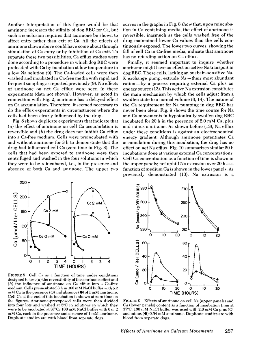 Dog erythrocytes (RBC) have a system for passive Ca and Na movements that resembles the Ca-Na exchanger first described in cardiac muscle. Amrinone, a new cardiotonic drug active in humans with congestive heart failure, is shown to stimulate net Ca uptake by dog RBC. Amrinone's action is on Ca influx rather than efflux. The influence of Amrinone on Ca uptake is enhanced when the cells are placed in low Na media; raising external Na or lowering intracellular Na both abolish the effect of the drug. The data suggest that amrinone potentiates passive Ca entry into the cells by a Na-dependent pathway. If Ca moves through myocardial sarcolemma as it does through dog RBC membranes, then the inotropic action of amrinone can be explained on the basis that the drug increases intracellular Ca levels.