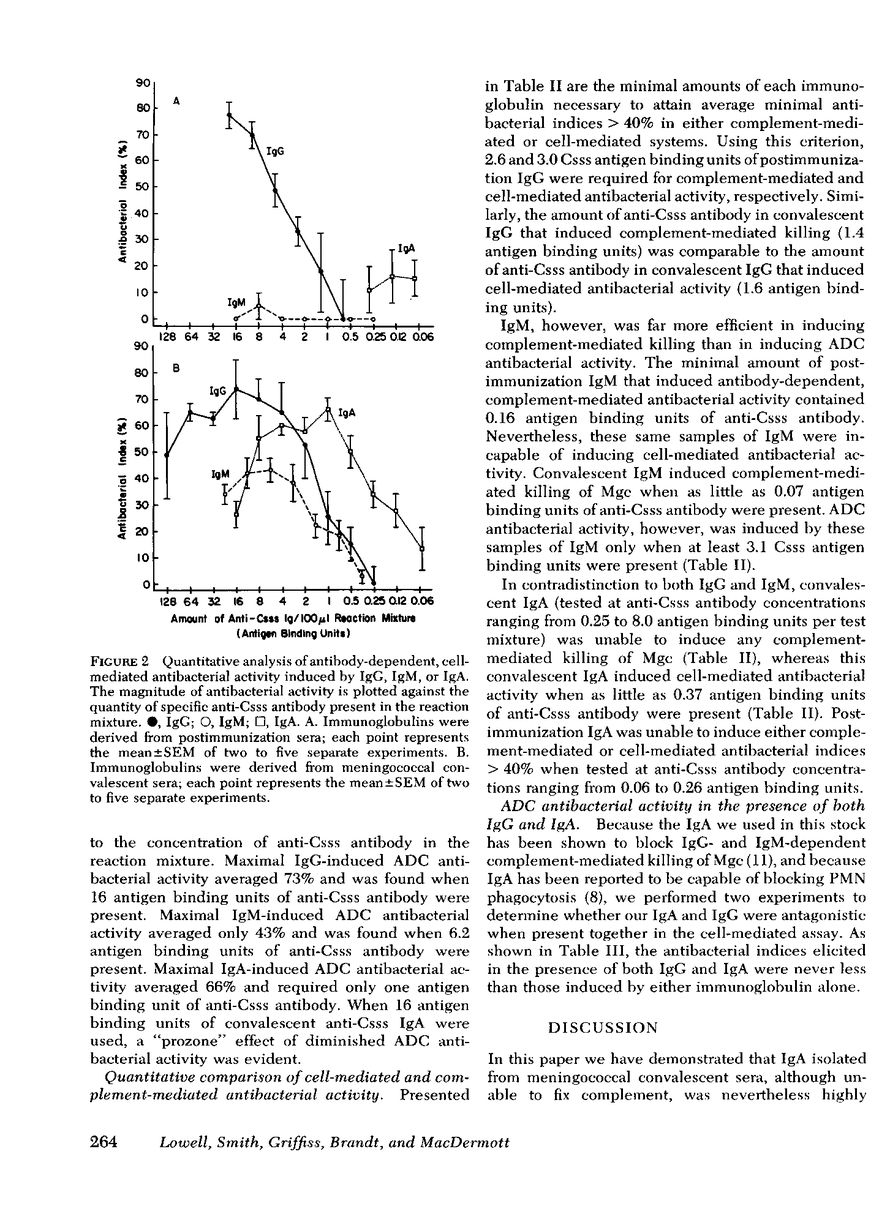 We have compared the abilities of immunoglobulin (Ig)G, IgM, and IgA to induce either mononuclear cell-mediated (complement-independent) or complement-mediated (cell-free) antibacterial activity against group C meningococci. In each of these assays, immunoglobulins purified from the sera of individuals immunized with meningococcal group C polysaccharide were compared with those purified from sera of patients convalescing from disseminated meningococcal disease. Our data support three conclusions. First, although nonbactericidal in cooperation with complement, IgA can induce cell-mediated antibacterial activity as well as IgG. Second, the amount of IgG required to induce cell-mediated antibacterial activity is similar to the amount required for complement-mediated killing. Third, although the amount of either postimmunization or convalescent IgM required to induce complement-mediated killing is 16- to 20-fold less than the amount of respective IgG required, IgM is inferior to IgG in its ability to induce cell-mediated antibacterial activity because in the cell-mediated system (a) postimmunization IgM is ineffective; (b) the amount of convalescent IgM required for minimal activity is eightfold more than the amount of convalescent IgG required; and (c) the maximal antibacterial index induced by convalescent IgM is 50% less than that which can be induced by IgG. These data suggest that IgG and IgA may play a greater role than IgM in mononuclear cell-mediated antibacterial host immune defense.