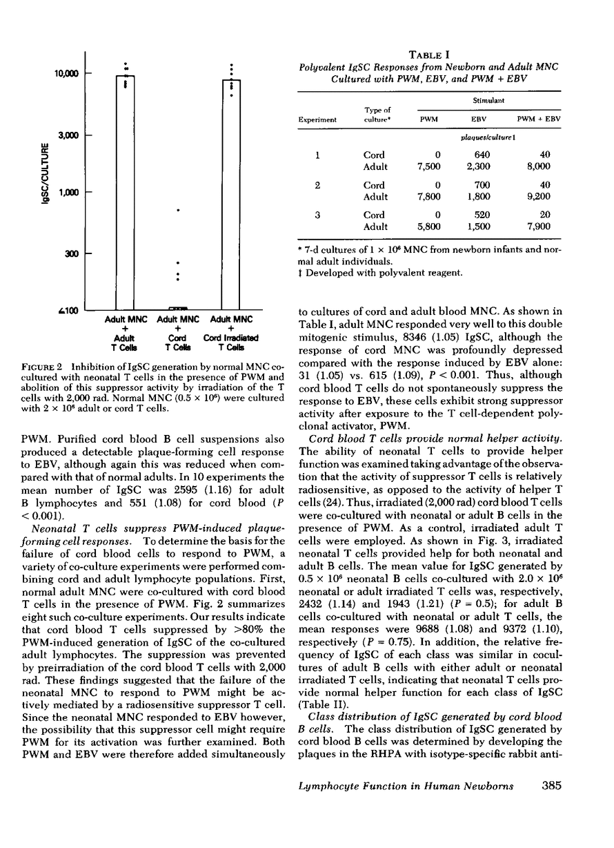 The functional maturity of T and B lymphocyte populations from human newborns was evaluated using a reverse hemolytic plaque assay to detect immunoglobulin-secreting cells generated in in vitro cultures stimulated with pokeweed mitogen (PWM), a T cell-dependent polyclonal activator, and the Epstein-Barr virus (EBV), a T cell-independent B cell activator. Cord blood lymphocytes failed to produce immunoglobulin in response to PWM, but did respond with immunoglobulin synthesis to stimulation with EBV. Co-culture experiments demonstrated that cord blood T cells would inhibit immunoglobulin production by adult cells stimulated with PWM, but not with EBV. Cord blood T cells did suppress immunoglobulin production by cord blood B cells when stimulated with a mixture of EBV and PWM, indicating that cord blood, in contrast to adult blood, contains a population of suppressor T cell precursors that are easily activated by PWM. Irradiation of the cord blood T cells with 2,000 rad eliminated the suppressor activity and revealed normal helper function for immunoglobulin (Ig) G, A, and M when these T cells were co-cultured with adult B cells. Cord blood B cells co-cultured with adult T cells or irradiated cord blood T cells did produce immunoglobulin in response to PWM, but the response was significantly lower than that of adult B cells, and only IgM was produced in these cultures. These studies demonstrate that both the T and B cells of the human newborn have significant functional differences compared with the functions of T and B lymphocyte populations in adults.