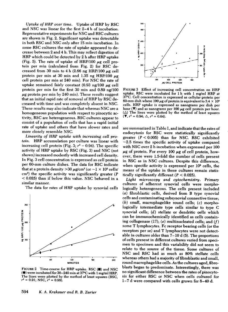 Human synovial tissue cells in monolayer can be shown to take up and digest a soluble protein, horseradish peroxidase (HRP). Uptake of HRP was linear with increasing concentrations of substrate and cell protein and with time for up to 4 h. Low temperature (4 degrees C), and sodium fluoride, an inhibitor of glycolysis were the most effective metabolic inhibitors of endocytosis. In addition, colchicine, an inhibitor of microtubule assembly, and yeast mannan, an inhibitor of mannose-specific receptors, reduced HRP uptake. Synovial cells from patients with rheumatoid arthritis (RSC) demonstrated a statistically significantly higher rate of endocytosis (247 +/- 107 ng HRP/100 micrograms cell protein per 2 h.) than cells from control, nonrheumatoid patients (NSC) (100 +/- 80 ng HRP/100 micrograms cell protein per 2 h). Thus, it is possible to discriminate RSC from NSC by their quantitatively different rates of endocytosis. Digestion of HRP by synovial cells is statistically significant by 6 h after uptake. A faster initial rate of digestion was seen in RSC. Over the first 6--8 h of incubation 42% of the endocytosed HRP was still cell-associated in RSC and 67% remained in NSC cultures. However, by 24 h 20--30% of endocytosed HRP was found in both types of cultures. These results indicate that endocytosed molecules may accumulate more rapidly in RSC and persist within their lysosomes for a longer time than in NSC. The quantitative determination of enhanced endocytosis by RSC compared with NSC suggests that this increased activity may have a role in the pathological function of synovial tissue in rheumatoid arthritis.