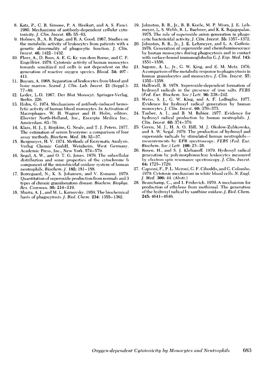 The antibody-dependent cell-mediated cytoxicity (ADCC) by human monocytes and neutrophils was investigated by measuring the release of 51chromate from prelabeled erythrocytes coated with immunoglobulin G. ADCC was found to be positively correlated to phagocytosis of 51Cr-labeled erythrocytes and to the postphagocytic events of the effector cells, activation of the hexose monophosphate shunt, and degranulation. Exclusion of oxygen from the incubation media halved the ADCC by both cell types without affectijg phagocytosis or degranulation. Likewise, ADCC by cells from patients suffering from chronic granulomatous disease (CGD) was only half the intensity of ADCC by cells from normals. Inhibitors of mitochondrial respiration were without depressing effect of ADCC. Azide, which in addition to its blocking action on oxydative phosphorylation also inhibits catalase and myeloperoxidase, resulted in a approximately equal to 40% stimulation of ADCC by cells from normals but was without effect of ADCC by cells from CGD patients. The hydroxyl radical scavenger, mannitol, significantly depressed ADCC by cells from normals (P < 0.01) but was without effect on cells from CGD patients. Azide and mannitol also were without effect on ADCC by normal cells when oxygen was excluded. In a xanthine-xanthine oxidase system, erythrocytes were effectively lysed. This lysis was inhibited by catalase, superoxide dismutase, and mannitol. When comparable concentrations of glucose oxidase were used no lysis was observed. H2O2 either alone or in combination with azide did not lyse erythrocytes. It is suggested that ADCC by both monocytes and neutrophils is partly dependent on the generation of hydroxyl radicals by the effector cells.