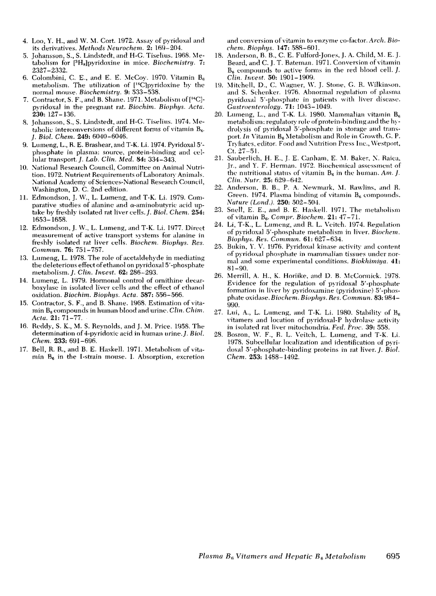 The plasma content of B6 vitamers is governed by, among other factors, dietary supply and metabolic interconversion. This study examines the effect of pyridoxine supplementation on the plasma content of B6 vitamers and pyridoxic acid in man, and the metabolic conversion and release of B6 compounds in isolated rat hepatocytes. Six healthy human subjects were given 100 mg pyridoxine-HCl/d orally for 1--3 wk. Before pyridoxine supplementation, the mean total plasma level of B6 vitamers was 114 +/- 9 nM; and pyridoxal-P, pyridoxamine-P, pyridoxal, pyridoxine, and pyridoxamine accounted for 54, 3, 11, 27, and 5%, respectively. Plasma level of pyridoxic acid was 40 +/- 7 nM. Thus, pyridoxal-P is the principal B6 vitamer in plasma. During pyridoxine supplementation, mean plasma levels of the B6 vitamers and pyridoxic acid increased to 655 +/- 122 and 222 +/- 55 nM, respectively. The plasma content of pyridoxal-P and pyridoxic acid increased 6--7-fold and that of pyridoxal, 12-fold, but the pyridoxine level did not increase. Isolated hepatocytes, 1 g/15 ml, were incubated for 2 h with 3.33 microM [14C]pyridoxine (6 microCi/mumol). At zero time, the cells contained about 35 nmol pyridoxal-P and 25 nmol pyridoxamine-P. After 2 h incubation, the cellular content of pyridoxal-P and pyridoxamine-P did not change significantly, but the medium contained 5.9 nmol pyridoxal-P, 0.3 nmol pyridoxamine-P, 7.2 nmol pyridoxal, 26.6 nmol pyridoxine, 0.3 nmol pyridoxamine, and 7.5 nmol pyridoxic acid. Whereas the specific radioactivity of pyridoxal-P, pyridoxal, and pyridoxic acid in the medium approached that of [14C]pyridoxine, the specific radioactivity of cellular pyridoxal-P and pyridoxamine-P was only 20% of that of pyridoxine. Thus, newly synthesized pyridoxal-P is not freely exchangeable with endogenous pyridoxal-P, but is preferentially released or degraded to pyridoxal and pyridoxic acid. The latter B6 compounds are also released. These results suggest that orally ingested pyridoxine is rapidly metabolized in liver and its products are released into the circulation in the form of pyridoxal-P, pyridoxal, and pyridoxic acid.