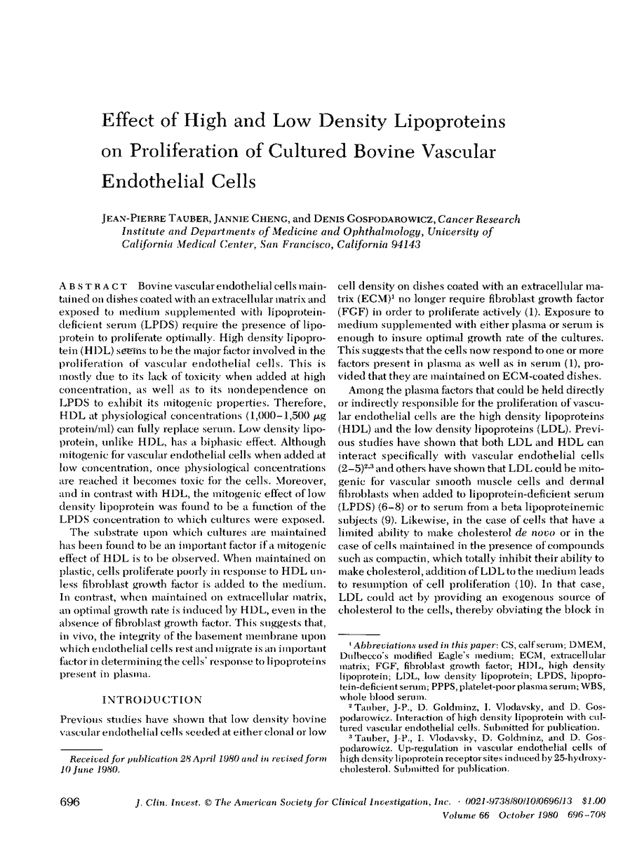 Bovine vascular endothelial cells maintained on dishes coated with an extracellular matrix and exposedto medium supplemented with lipoprotein-deficient serum (LPDS) require the presence of lipoprotein to proliferate optimally. High density lipoprotein (HDL) seems to be the major factor involved in the proliferation of vascular endothelial cells. This is mostly due to its lack of toxicity when added at high concentration, as well as to its nondependence on LPDS to exhibit its mitogenic properties. Therefore, HDL at physiological concentrations (1,000--1,500 microgram protein/ml) can fully replace serum. Low density lipoprotein, unlike HDL, has a biphasic effect. Although mitogenic for vascular endothelial cells when added at low concentration, once physiological concentrations are reached it becomes toxic for the cells. Moreover, and in contrast with HDL, the mitogenic effect of low density lipoprotein was found to be a function of the LPDS concentration to which cultures were exposed. The substrate upon which cultures are maintained has been found to be an important factor if a mitogenic effect of HDL is to be observed. When maintained on plastic, cells proliferate poorly in response to HDL unless fibroblast growth factor is added to the medium. In contrast, when maintained on extracellular matrix, an optimal growth rate is induced by HDL, even in the absence of fibroblast growth factor. This suggests that, in vivo, the integrity of the basement membrane upon which endothelial cells rest and migrate is an important factor in determining the cells response to lipoproteins present in plasma.