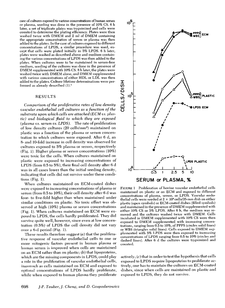 Bovine vascular endothelial cells maintained on dishes coated with an extracellular matrix and exposedto medium supplemented with lipoprotein-deficient serum (LPDS) require the presence of lipoprotein to proliferate optimally. High density lipoprotein (HDL) seems to be the major factor involved in the proliferation of vascular endothelial cells. This is mostly due to its lack of toxicity when added at high concentration, as well as to its nondependence on LPDS to exhibit its mitogenic properties. Therefore, HDL at physiological concentrations (1,000--1,500 microgram protein/ml) can fully replace serum. Low density lipoprotein, unlike HDL, has a biphasic effect. Although mitogenic for vascular endothelial cells when added at low concentration, once physiological concentrations are reached it becomes toxic for the cells. Moreover, and in contrast with HDL, the mitogenic effect of low density lipoprotein was found to be a function of the LPDS concentration to which cultures were exposed. The substrate upon which cultures are maintained has been found to be an important factor if a mitogenic effect of HDL is to be observed. When maintained on plastic, cells proliferate poorly in response to HDL unless fibroblast growth factor is added to the medium. In contrast, when maintained on extracellular matrix, an optimal growth rate is induced by HDL, even in the absence of fibroblast growth factor. This suggests that, in vivo, the integrity of the basement membrane upon which endothelial cells rest and migrate is an important factor in determining the cells response to lipoproteins present in plasma.