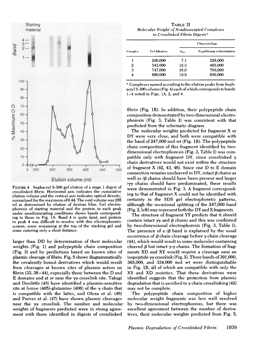 Crosslinked fibrin was digested by plasmin, and three soluble complexes larger than DD/E were purified and characterized. After gel filtration chromatography, the purified complexes were shown to have molecular weights of 465,000, 703,000, and 850,000, as determined by equilibrium sedimentation. Each of the complexes was dissociated into two or more fragments by SDS-polyacrylamide gel electrophoresis. The structure of these subunit fragments was deduced from determinations of their molecular weights and polypeptide chain composition and from known sites of plasmin cleavage of fibrin. Fragments larger than DD have been identified that contain intact γγ crosslinks as well as fragments resulting from cleavages at or near this site. The former include DY (mol wt 247,000), YY (mol wt 285,000), DXD (mol wt 461,000), and YXD (mol wt 500,000); and the latter include fragments XD (mol wt 334,000) and XY (mol wt 391,000). A schematic model was developed to explain the structure of the large noncovalently bound complexes based on their molecular weight and observed component fragments. Our scheme supports the two-stranded half-staggered overlap model as the basic unit of fibrin structure, in which each complex consists of fragments from two adjacent complementary antiparallel fibrin strands. The smallest derivative, complex 1, is the DD/E complex; complex 2 contains apposed DY and YD fragments, and complex 3 consists of fragments DXD and YY. Complex 4 is less well-characterized, but its intact structure is projected to consist of YXD and DXY fragments from adjacent fibrin strands. Each complex is heterogeneous in subunit composition, reflecting additional plasmin cleavages within and/or adjacent to its theoretical boundaries. Since most of the protein initially released into solution from degrading fibrin is as complexes larger than DD/E, the derivatives described in this report are likely to be major circulating degradation products of crosslinked fibrin in vivo.