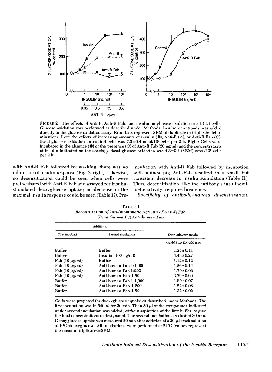 Antibodies against the insulin receptor (Anti-R), which are found in the serum of type B patients with the syndrome of insulin resistance and acanthosis nigricans, inhibit the binding of insulin to its receptor and mimic the actions of insulin when studied acutely in vitro. After prolonged exposure of 3T3-L1 cells to Anti-R, the insulinomimetic activity is lost, and the cells show a marked decrease in their maximal response to insulin (antibody-induced desensitization), thus providing a model for the insulin resistance seen in vivo. This study explores in detail the mechanism and specificity of desensitization in 3T3-L1 cells.