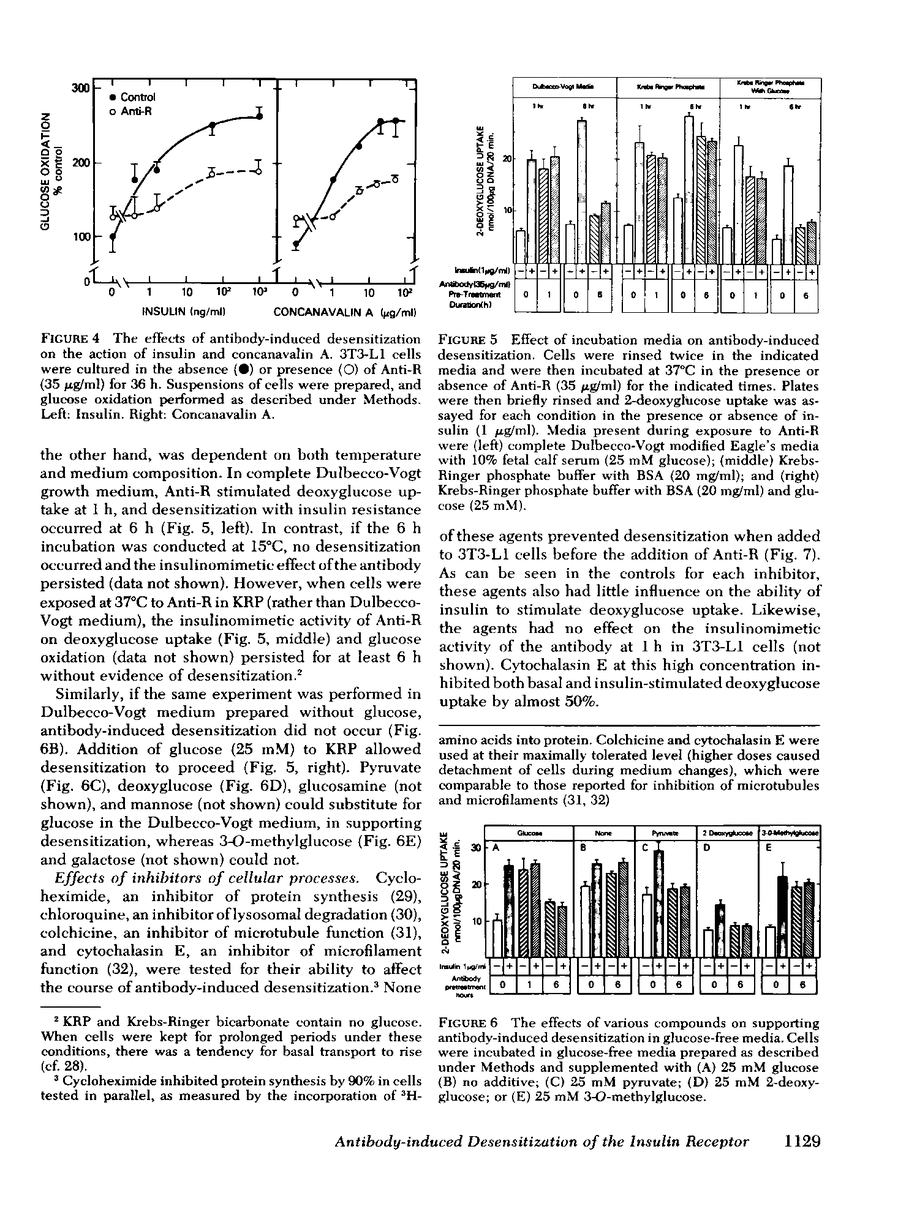 Antibodies against the insulin receptor (Anti-R), which are found in the serum of type B patients with the syndrome of insulin resistance and acanthosis nigricans, inhibit the binding of insulin to its receptor and mimic the actions of insulin when studied acutely in vitro. After prolonged exposure of 3T3-L1 cells to Anti-R, the insulinomimetic activity is lost, and the cells show a marked decrease in their maximal response to insulin (antibody-induced desensitization), thus providing a model for the insulin resistance seen in vivo. This study explores in detail the mechanism and specificity of desensitization in 3T3-L1 cells.