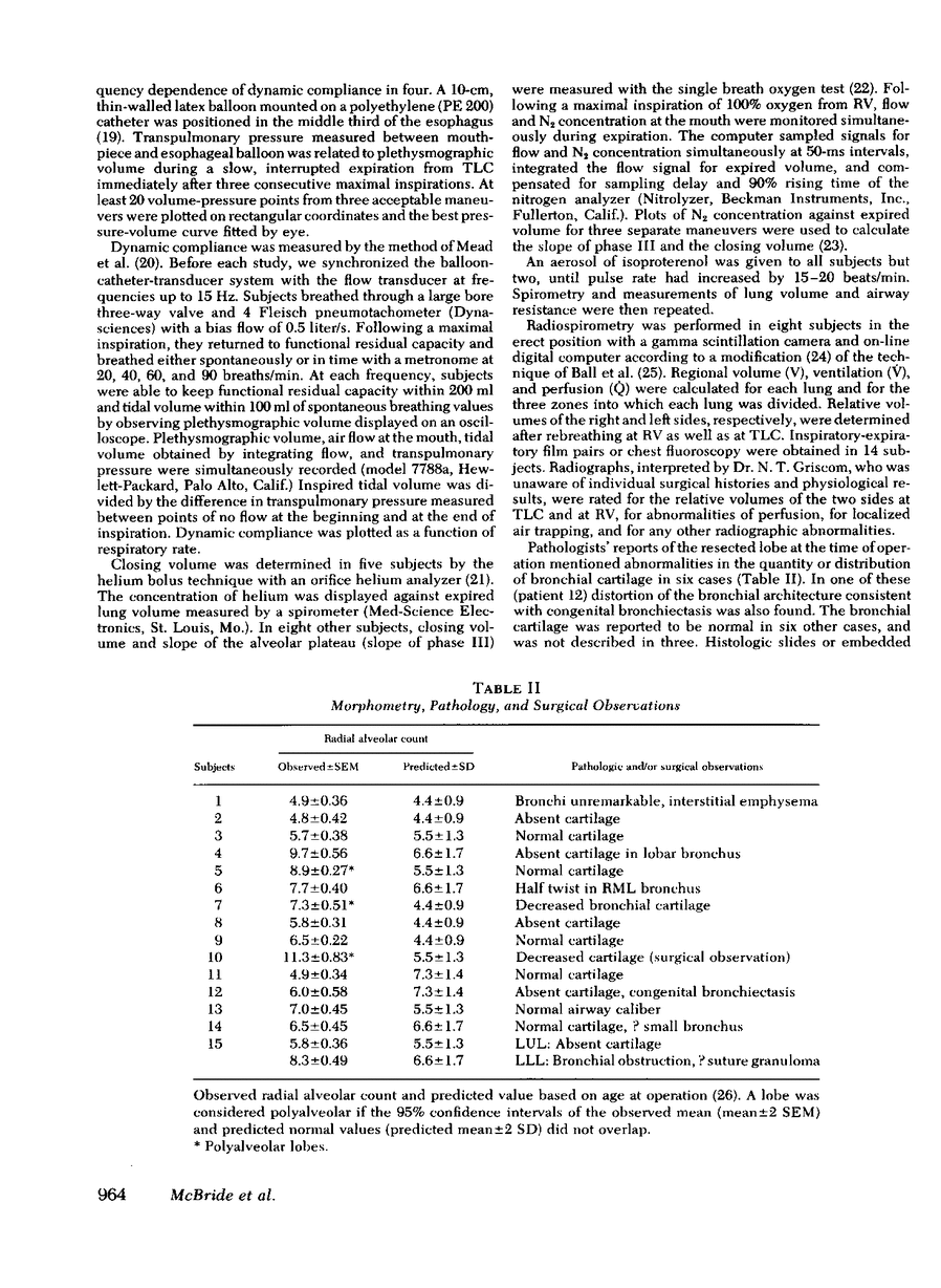 To characterize the outcome of lobectomy in infancy and the low expiratory flows which persist after lobectomy for congenital lobar emphysema, 15 subjects with this history were studied at age 8-30 yr. Total lung capacity was normal in all, but higher values (P < 0.05) were observed in nine subjects with upper lobectomy than in five subjects with right middle lobectomy. Ratio of residual volume to total lung capacity was correlated (P < 0.05) with the amount of lung missing as estimated from normal relative weights of the respective lobes. Xe133 radiospirometry in eight subjects showed that the operated and unoperated sides had nearly equal volumes at total lung capacity, but that the operated side was larger than the unoperated side at residual volume. Perfusion was equally distributed between the two sides. Similar findings were detected radiographically in four other subjects. Forced expiratory volume in 1 s and maximal midexpiratory flow rate averaged 72 and 45% of predicted, respectively. Low values of specific airway conductance and normal density dependence of maximal flows in 12 subjects suggested that obstruction was not limited to peripheral airways. Pathologic observations at the time of surgery and morphometry of the resected lobes were not correlated with any test of pulmonary function.