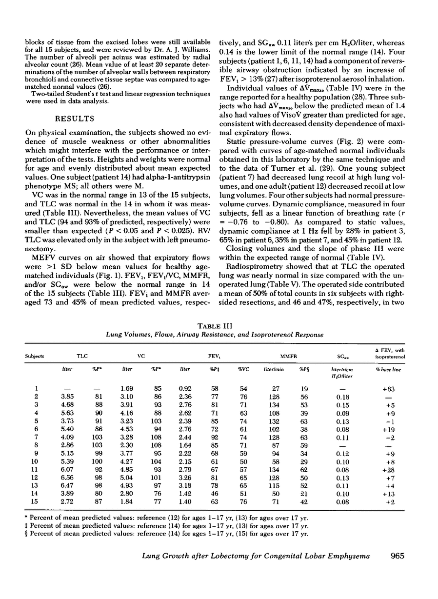 To characterize the outcome of lobectomy in infancy and the low expiratory flows which persist after lobectomy for congenital lobar emphysema, 15 subjects with this history were studied at age 8-30 yr. Total lung capacity was normal in all, but higher values (P < 0.05) were observed in nine subjects with upper lobectomy than in five subjects with right middle lobectomy. Ratio of residual volume to total lung capacity was correlated (P < 0.05) with the amount of lung missing as estimated from normal relative weights of the respective lobes. Xe133 radiospirometry in eight subjects showed that the operated and unoperated sides had nearly equal volumes at total lung capacity, but that the operated side was larger than the unoperated side at residual volume. Perfusion was equally distributed between the two sides. Similar findings were detected radiographically in four other subjects. Forced expiratory volume in 1 s and maximal midexpiratory flow rate averaged 72 and 45% of predicted, respectively. Low values of specific airway conductance and normal density dependence of maximal flows in 12 subjects suggested that obstruction was not limited to peripheral airways. Pathologic observations at the time of surgery and morphometry of the resected lobes were not correlated with any test of pulmonary function.
