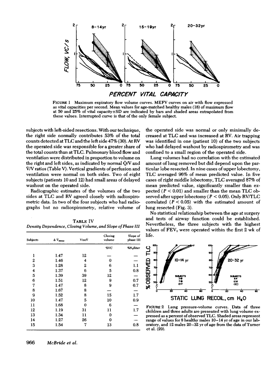 To characterize the outcome of lobectomy in infancy and the low expiratory flows which persist after lobectomy for congenital lobar emphysema, 15 subjects with this history were studied at age 8-30 yr. Total lung capacity was normal in all, but higher values (P < 0.05) were observed in nine subjects with upper lobectomy than in five subjects with right middle lobectomy. Ratio of residual volume to total lung capacity was correlated (P < 0.05) with the amount of lung missing as estimated from normal relative weights of the respective lobes. Xe133 radiospirometry in eight subjects showed that the operated and unoperated sides had nearly equal volumes at total lung capacity, but that the operated side was larger than the unoperated side at residual volume. Perfusion was equally distributed between the two sides. Similar findings were detected radiographically in four other subjects. Forced expiratory volume in 1 s and maximal midexpiratory flow rate averaged 72 and 45% of predicted, respectively. Low values of specific airway conductance and normal density dependence of maximal flows in 12 subjects suggested that obstruction was not limited to peripheral airways. Pathologic observations at the time of surgery and morphometry of the resected lobes were not correlated with any test of pulmonary function.