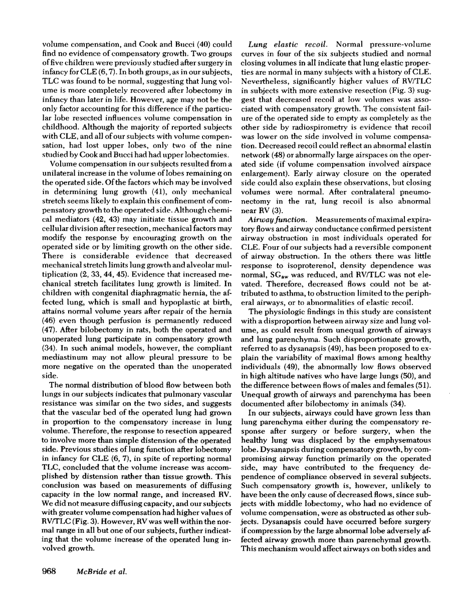 To characterize the outcome of lobectomy in infancy and the low expiratory flows which persist after lobectomy for congenital lobar emphysema, 15 subjects with this history were studied at age 8-30 yr. Total lung capacity was normal in all, but higher values (P < 0.05) were observed in nine subjects with upper lobectomy than in five subjects with right middle lobectomy. Ratio of residual volume to total lung capacity was correlated (P < 0.05) with the amount of lung missing as estimated from normal relative weights of the respective lobes. Xe133 radiospirometry in eight subjects showed that the operated and unoperated sides had nearly equal volumes at total lung capacity, but that the operated side was larger than the unoperated side at residual volume. Perfusion was equally distributed between the two sides. Similar findings were detected radiographically in four other subjects. Forced expiratory volume in 1 s and maximal midexpiratory flow rate averaged 72 and 45% of predicted, respectively. Low values of specific airway conductance and normal density dependence of maximal flows in 12 subjects suggested that obstruction was not limited to peripheral airways. Pathologic observations at the time of surgery and morphometry of the resected lobes were not correlated with any test of pulmonary function.