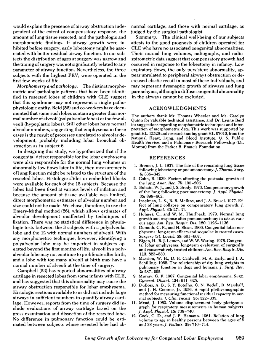 To characterize the outcome of lobectomy in infancy and the low expiratory flows which persist after lobectomy for congenital lobar emphysema, 15 subjects with this history were studied at age 8-30 yr. Total lung capacity was normal in all, but higher values (P < 0.05) were observed in nine subjects with upper lobectomy than in five subjects with right middle lobectomy. Ratio of residual volume to total lung capacity was correlated (P < 0.05) with the amount of lung missing as estimated from normal relative weights of the respective lobes. Xe133 radiospirometry in eight subjects showed that the operated and unoperated sides had nearly equal volumes at total lung capacity, but that the operated side was larger than the unoperated side at residual volume. Perfusion was equally distributed between the two sides. Similar findings were detected radiographically in four other subjects. Forced expiratory volume in 1 s and maximal midexpiratory flow rate averaged 72 and 45% of predicted, respectively. Low values of specific airway conductance and normal density dependence of maximal flows in 12 subjects suggested that obstruction was not limited to peripheral airways. Pathologic observations at the time of surgery and morphometry of the resected lobes were not correlated with any test of pulmonary function.