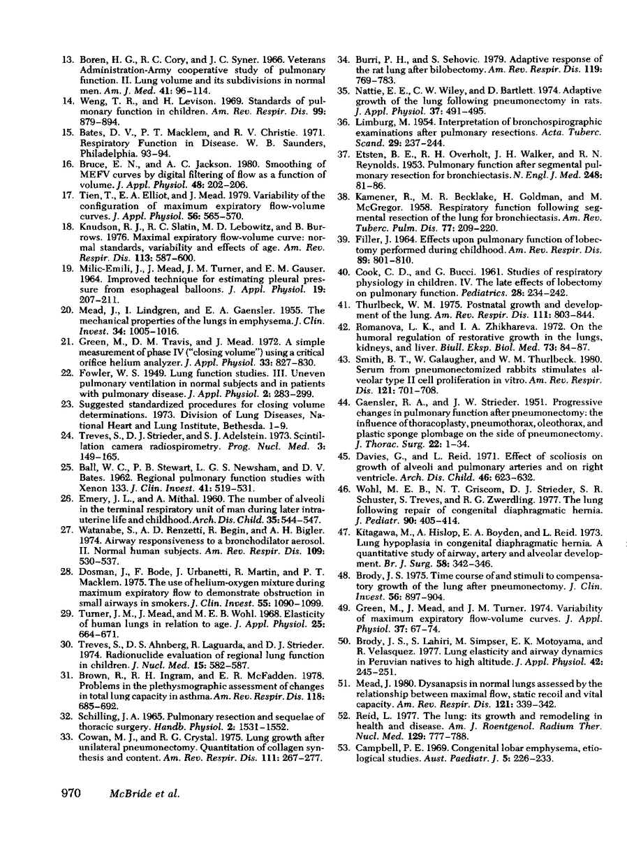 To characterize the outcome of lobectomy in infancy and the low expiratory flows which persist after lobectomy for congenital lobar emphysema, 15 subjects with this history were studied at age 8-30 yr. Total lung capacity was normal in all, but higher values (P < 0.05) were observed in nine subjects with upper lobectomy than in five subjects with right middle lobectomy. Ratio of residual volume to total lung capacity was correlated (P < 0.05) with the amount of lung missing as estimated from normal relative weights of the respective lobes. Xe133 radiospirometry in eight subjects showed that the operated and unoperated sides had nearly equal volumes at total lung capacity, but that the operated side was larger than the unoperated side at residual volume. Perfusion was equally distributed between the two sides. Similar findings were detected radiographically in four other subjects. Forced expiratory volume in 1 s and maximal midexpiratory flow rate averaged 72 and 45% of predicted, respectively. Low values of specific airway conductance and normal density dependence of maximal flows in 12 subjects suggested that obstruction was not limited to peripheral airways. Pathologic observations at the time of surgery and morphometry of the resected lobes were not correlated with any test of pulmonary function.