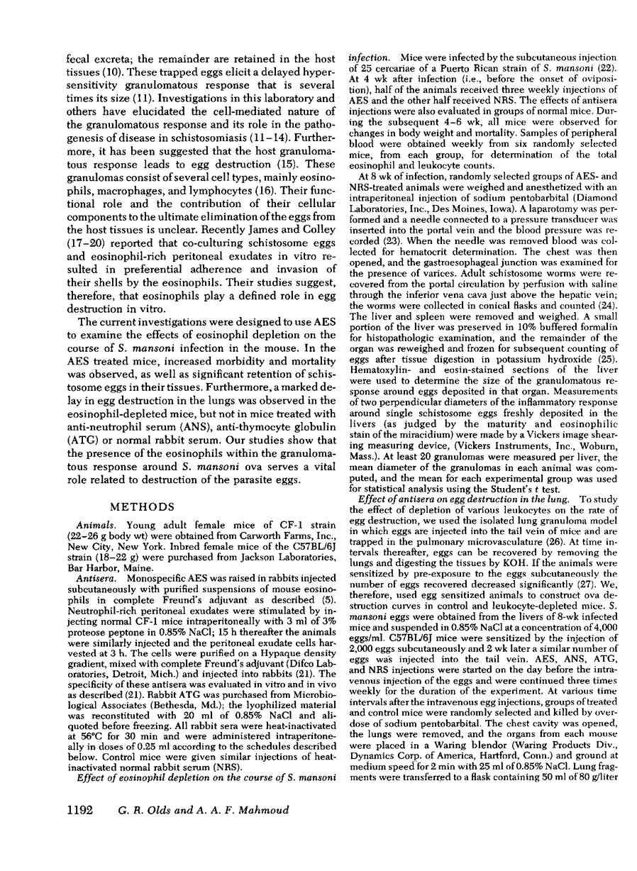 Eosinophils form 50% of cells in the host granulomatous response to Schistosoma mansoni eggs, but their functional role in these granulomas and their relation to egg destruction is unknown. We have studied the course of S. mansoni infection in mice treated with normal rabbit serum (NRS) or depleted of their eosinophils by monospecific anti-eosinophil serum (AES). At 6-wk of infection (after 2 wk of egg deposition) the AES-treated animals were similar to NRS-treated controls with the exception that hepatic granulomas in the AES-treated animals were 50% smaller and devoid of eosinophils. At 8 wk of infection, AES-treated mice had significantly higher mortality, spleen weight, portal pressure, and 80% more eggs retained in their livers. These data suggest that eosinophil depletion delayed egg destruction. We subsequently studied destruction of eggs injected into the pulmonary microvasculature of sensitized mice. 2,000 S. mansoni eggs were intravenously injected into the tail veins of mice treated with NRS, anti-neutrophil serum, AES or ATG (anti-thymocyte globulin); at time intervals the remaining eggs were recovered from the lungs by tissue digestion. Egg recovery from NRS- or anti-neutrophil serum-treated mice began to decrease by day 16 and the percent recovery of eggs at day 24 was 55 and 52%, respectively. In contrast, animals treated with AES had smaller lung granulomas that were devoid of eosinophils and a marked delay of egg destruction was seen. It took until day 44 for 50% of the eggs to be destroyed. In ATG-treated animals smaller granulomas were seen that had diminished lymphocytes and also 75% less eosinophils. ATG treatment apparently slowed egg destruction but was not statistically significant. Our data define the role of the eosinophils in destruction of schistosome eggs in vivo and delineates the protective function of these cells within the host granulomatous response.