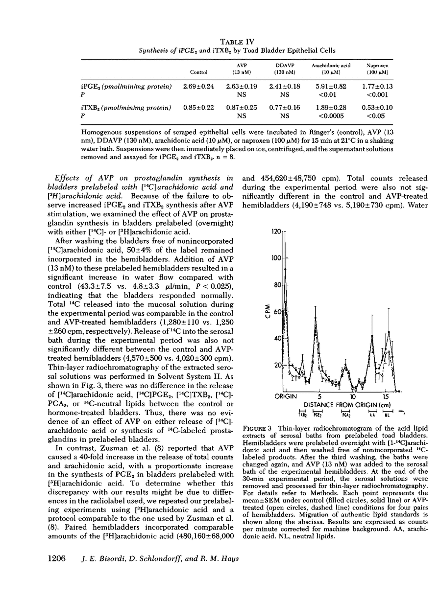 Prostaglandins are important modulators of the action of vasopressin. Others researchers have proposed that vasopressin stimulates prostaglandin synthesis, completing a negative feedback loop and thereby limiting vasopressin's antidiuretic effect. We have re-examined this question, using specific radioimmunoassay and thin-layer radiochromatography to determine prostaglandin synthesis by the toad bladder. Under control conditions, the bladder synthesizes prostaglandin (PG)E2 and thromboxane (TX)B2. There was no evidence for synthesis of PGE1 or PGF2 alpha by radioimmunoassay, or of other prostaglandins by radiochromatography. Furthermore, there was no evidence for metabolism of PGE2 by the bladder. Using a variety of protocols, in isolated epithelial cells as well as intact bladders, we were unable to detect any significant increase in PGE2 or TXB2 synthesis after stimulation with arginine vasopressin (AVP) or deamino-8-D-arginine vasopressin (DDAVP). Arachidonic acid, the specific precursor of prostaglandin synthesis, increased PGE2 synthesis twofold, and significantly inhibited AVP- and DDAVP-stimulated water flow by 60 and 75%, respectively. Naproxen and acetaminophen inhibited prostaglandin synthesis and enhanced water flow in response to AVP and DDAVP (44-54%). Our findings indicate that the toad bladder produces tow prostaglandins, PGE2 and TXB2, and that vasopressin does not alter their rate of synthesis. Because agents such as acetaminophen and naproxen inhibit prostaglandin synthesis and enhance vasopressin- and DDAVP-stimulated water flow, we suggest that it is the inhibitory effect of these agents on the hormone-independent rate of prostaglandin synthesis that is responsible for their enhancement of water flow. Furthermore, because AVP appears to increase prostaglandin synthesis by the intact kidney, we suggest that cells other than those of the collecting tubule are responsible for the increased prostaglandin production.
