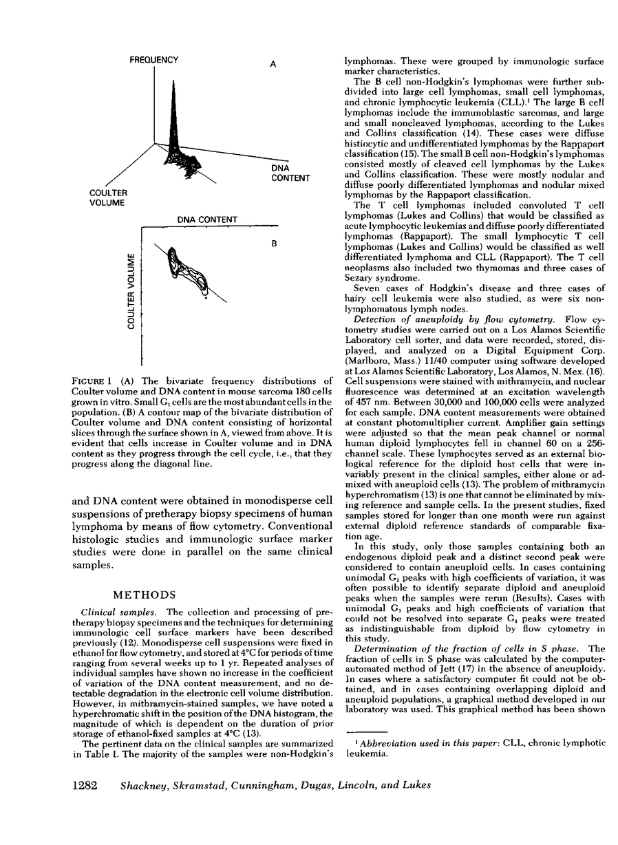 Dual parameter flow cytometry studies using Coulter volume and cell DNA content were carried out in monodisperse cell suspensions of 64 samples of human lymphoma, chronic lymphocytic leukemia, hairy cell leukemia, and benign lymphoid proliferations. Differences in mean Coulter volume among the lymphomas were due both to the intrinsic differences in mean G1 cell Coulter volume and to the presence of increased fractions of larger S and G2 cells, especially among the large B cell lymphomas. However, the relative contribution of large non-G1 cells to the overall population Coulter volume distribution was a relatively minor one; the presence of cells in S did not increase mean Coulter volume by more than 10%, even in samples with high S fractions. There was a good correlation between mean G1 cell Coulter volume and the log of the fraction of cells in S among the B cell lymphomas (r = 0.55). Evidence is presented that within individual samples, large cells proliferate more rapidly than small cells. This was seen in every case, both in the normal samples and in the lymphomas, and in the T cell lymphomas as well as in the B cell lymphomas. Aneuploidy was detected by flow cytometry in 11 cases; in 7 cases the aneuploid cell component could be analyzed separately from the diploid cell component on the basis of cell Coulter volume differences. The aneuploid components of diploid-aneuploid mixtures had higher S fractions than the diploid components in six of seven cases (0.16 +/- 0.04 [SE] vs. 0.08 +/- 0.02). These findings are considered in relation to the histopathological classification of the lymphomas, and in relation to the concept of clonal selection and clonal evolution of tumors.