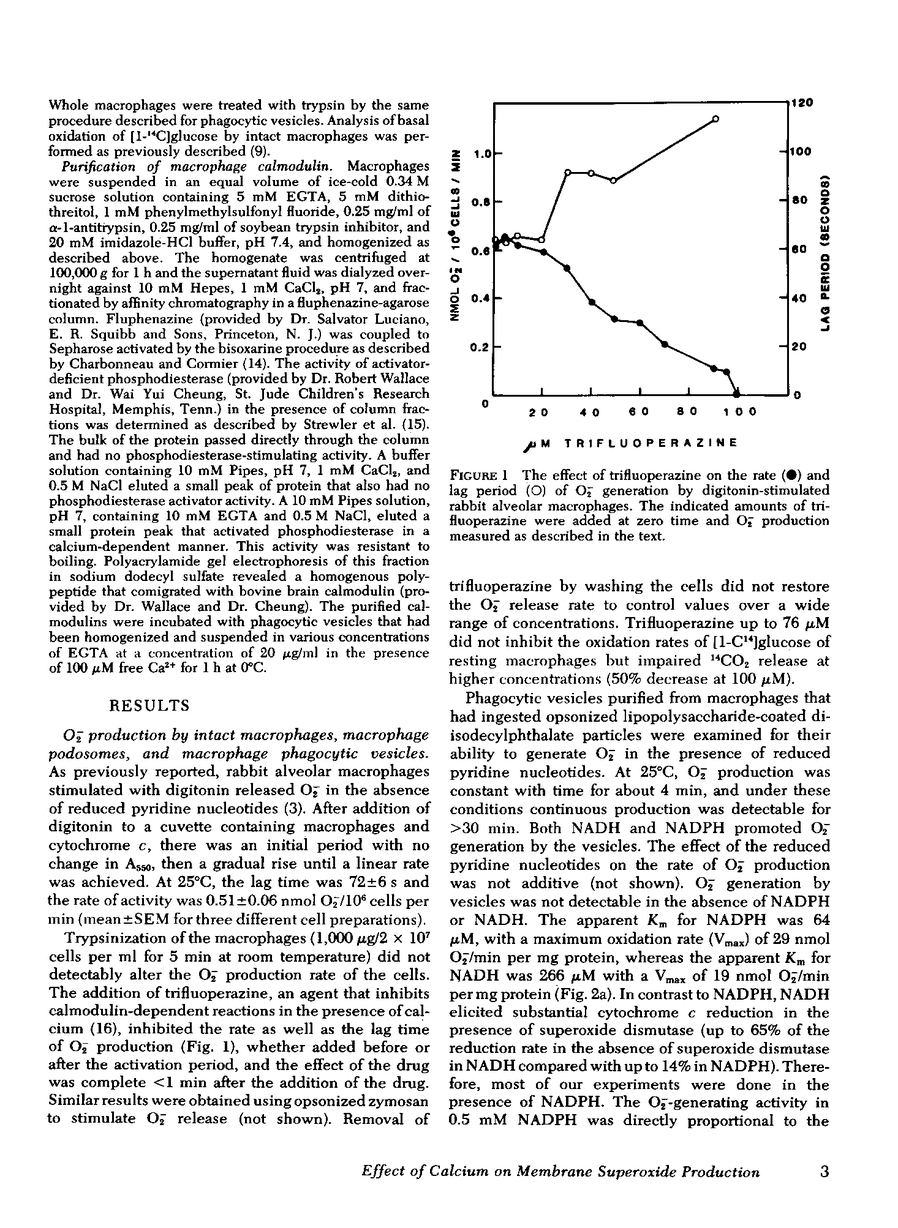Phagocytic vesicles from rabbit lung macrophages produced superoxide in the presence of NADH or NADPH. At 37°C, these vesicles generated 51±7.8 nmol O2−/min per mg protein in the presence of 0.5 mM NADPH. The apparent Km for NADPH and NADH (66 and 266 μM, respectively), the pH optimum for the reaction (6.9), and the cyanide insensitivity were similar to properties of plasma membrane-rich fractions of stimulated polymorphonuclear leukocytes studied by others. The activity of the phagocytic vesicles was trypsin sensitive. The specific superoxide-generating activity of macrophage phagocytic vesicles isolated from cells incubated up to 90 min with phagocytic particles remained constant.
