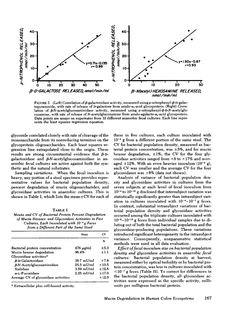 Recent work indicates that subpopulations of human fecal bacteria, averaging ∼1% of the total viable fecal flora, degrade the oligosaccharide side chains of hog gastric mucin, which structurally resembles human epithelial mucins. Here we report studies to determine whether degradation of mucin oligosaccharides is related to glycosidase production by bacteria growing in anaerobic fecal cultures. Triplicate cultures containing hog gastric mucin were inoculated with serially diluted feces from each of seven healthy subjects. When the stationary growth phase was attained, mucin oligosaccharide degradation and both cell-bound and extracellular activities of four glycosidases were measured in each culture. Cell-bound β-d-galactosidase, β-N-acetylglucosaminidase, and sialidase were present in bacteria growing at all levels of fecal inocula, including 10−11 g. In contrast, extracellular activities were present in every culture inoculated with 10−4−10−7 g feces, but were diminished or absent in cultures inoculated with 10−8−10−11 g feces. Bacterial autolysis was an unlikely cause of extracellular glycosidase activity, since p-nitrophenyl-α-l-fucosidase remained cell bound in cultures at every level of fecal inoculum. Degradation of mucin oligosaccharides was associated with extracellular, but not with cell-bound β-d-galactosidase, β-N-acetylglucosaminidase, and sialidase. Among the seven subjects, the estimated most probable numbers (MPN) of fecal bacteria producing extracellular β-d-galactosidase, β-N-acetylglucosaminidase, and sialidase ranged from 106−1010/g dry fecal wt, were comparable to the MPN of mucin-degrading bacteria, and were significantly smaller than the MPN of total fecal bacteria.