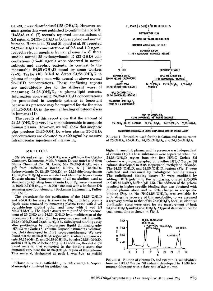 Plasma 25-hydroxyvitamin D and 24, 25-dihydroxy-vitamin D [24,25-(OH)2D] concentrations were measured in normal and chronically dialyzed anephric humans and pigs. Measurement of the 24, 25-(OH)2D was preceded by three purification steps involving one Sephadex LH-20 column and two high-pressure liquid chromatographic columns. The final high-pressure liquid chromatography step involved resolution of 25-hydroxy-vitamin D3-26,23 lactone and 25,26-dihydroxy-vitamin D2 from 24,25-dihydroxyvitamin D2 and 24,25-dihydroxyvitamin D3 [24,25-(OH)2D3]. The total 25-hydroxyvitamin D [25-hydroxyvitamin D2 plus 25-hydroxyvitamin D3 (25-OHD3)] was 31.7±3.6 ng/ml in the plasma of eight anephric human subjects and 40.1±3.7 ng/ml in five normal human subjects. Six of the eight anephric patients had undetectable (<0.2 ng/ml) 24,25-(OH)2D concentrations. Two of the eight patients had very low (0.51 and 0.41 ng/ml), but detectable, 24,25-dihydroxyvitamin D2. The normal human volunteers had plasma 24,25-(OH)2D concentrations of 2.8±0.7 ng/ml. Chronically dialyzed anephric and normal pigs were given intramuscular injections of massive amounts (5 × 106 IU) of vitamin D3 immediately after surgery (day 0) and again on day 7. In anephric pigs, plasma 25-OHD3 progressively rose from 12±4 ng/ml on day 0 to 705±62 ng/ml on day 10. The 25-OHD3 concentrations in normal pigs rose from 8±2 ng/ml on day 0 to 439±64 ng/ml on day 10. Plasma 25-OHD3 was higher in anephrics throughout the experiment, and concentrations were significantly higher (P < 0.05) on days 9 and 10. Plasma 24,25-(OH)2D3 concentrations declined progressively in anephric pigs from 3.6±0.6 ng/ml on day 0 to 3.2±0.7 ng/ml on day 2. During days 4-10, plasma 24,25-(OH)2D3 was not apparent until plasma 25-OHD3 was >400 ng/ml. In control pigs, plasma 24,25-(OH)2D3 was elevated from 4.3±0.6 ng/ml on day 0 to 178±2.7 ng/ml on day 3. Plasma 24,25-(OH)2D3 was significantly higher (P < 0.05) in controls on days 1-8. At the end of the experiment (day 10), 24,25-(OH)2D3 concentrations were similar and not significantly different in both groups (87.0±18.4 ng/ml in anephric and 110.3±32.1 ng/ml in normal pigs). The identity of the 24,25-(OH)2D3 isolated from anephric pig plasma was confirmed by mass spectroscopy. Our data suggest that anephric humans receiving normal dietary levels of vitamin D3 have little or no ability to produce 24,25-(OH)2D. However, we have shown that pigs produce 24,25-(OH)2D3 when plasma 25-OHD3 is extremely high (>400 ng/ml).