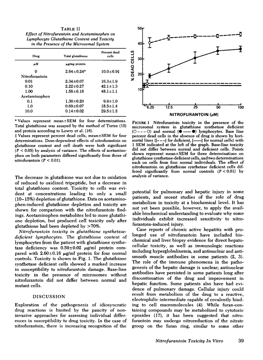 Nitrofurantoin, a commonly used urinary tract antiseptic, has been associated with idiosyncratic pulmonary and hepatic damage. We have used human lymphocytes in vitro to explore the biochemical basis of susceptibility to nitrofurantoin toxicity. The drug itself did not damage the cells as assessed by trypan blue dye exclusion. In the presence of a mouse hepatic microsomal drug-activating system, however, nitrofurantoin metabolites produced dose dependent toxicity to the lymphocytes. Inhibition of the enzyme epoxide hydrolase did not enhance toxicity; the metabolite thus does not appear to be a furan epoxide. Binding of reactive metabolites to cell macromolecules may lead directly to cell death, or in vivo, by acting as haptens to secondary immunologic responses. The metabolite caused a dose-dependent depletion of lymphocyte glutathione content. Cells from a patient with glutathione synthetase deficiency showed markedly enhanced nitrofurantoin toxicity. The findings suggest that glutathione plays a major role in protecting cells from nitrofurantoin-induced damage, and that studies of lymphocyte toxicity and glutathione metabolism in patients experiencing idiosyncratic reactions to nitrofurantoin may lead to elucidation of the biochemical and genetic basis of drug susceptibility.