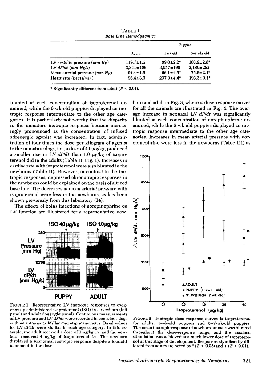 The myocardial responsiveness of conscious, instrumental dogs to exogenously administered isoproterenol and norepinephrine was investigated in neonatal, 6-wk-old, and adult animals. Comparable base-line values for peak left ventricular derivative of pressure with respect to time were observed in all age categories. However, when compared with adult responses, the sympathomimetic amine-induced increases in neonatal left ventricular dP/dt were significantly blunted at each concentration of adrenergic agonist examined, whereas the 6-wk-old puppies displayed an intermediate inotropic response. To investigate the cellular mechanisms of this blunted neonatal response, we correlated physiologic and biochemical measurements of the myocardial responses to catecholamines in each age category. When compared with adult myocardial membrane preparations, neonatal cardiac membranes were characterized in vitro by an increased density of beta-adrenergic binding sites, comparable affinity for adrenergic agonists and antagonists, and an enhanced coupling of adenylate cyclase activation to receptor occupancy. Simultaneous changes in either the serum catecholamine concentration or the membrane content of other intrinsic proteins failed to account for the observed neonatal increase in beta-adrenergic receptor density. These findings are most consistent with a compensatory mechanism of the cardiac cell membrane, whereby an inherent depression in the adrenergic responsiveness of the immature myocardium appears to induce the increase in receptor density and activation of adenylate cyclase.