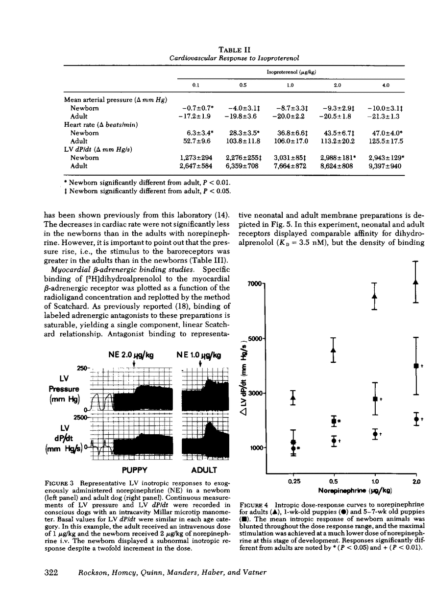 The myocardial responsiveness of conscious, instrumental dogs to exogenously administered isoproterenol and norepinephrine was investigated in neonatal, 6-wk-old, and adult animals. Comparable base-line values for peak left ventricular derivative of pressure with respect to time were observed in all age categories. However, when compared with adult responses, the sympathomimetic amine-induced increases in neonatal left ventricular dP/dt were significantly blunted at each concentration of adrenergic agonist examined, whereas the 6-wk-old puppies displayed an intermediate inotropic response. To investigate the cellular mechanisms of this blunted neonatal response, we correlated physiologic and biochemical measurements of the myocardial responses to catecholamines in each age category. When compared with adult myocardial membrane preparations, neonatal cardiac membranes were characterized in vitro by an increased density of beta-adrenergic binding sites, comparable affinity for adrenergic agonists and antagonists, and an enhanced coupling of adenylate cyclase activation to receptor occupancy. Simultaneous changes in either the serum catecholamine concentration or the membrane content of other intrinsic proteins failed to account for the observed neonatal increase in beta-adrenergic receptor density. These findings are most consistent with a compensatory mechanism of the cardiac cell membrane, whereby an inherent depression in the adrenergic responsiveness of the immature myocardium appears to induce the increase in receptor density and activation of adenylate cyclase.