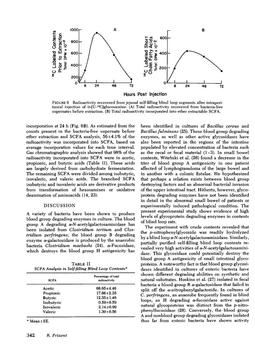 Contents obtained from jejunum of normal controls, self-emptying and self-filling blind loop rats were analyzed for the presence of glycoprotein-degrading glycosidases. The blind loop syndrome was documented by the increased fat excretion and slower growth rate of self-filling blind loop rats 6 wk after surgery. With p-nitrophenylglycosides as substrate, the specific activity of α-N-acetylgalactosaminidase, a potential blood group A destroying glycosidase, was 0.90±0.40 mU/mg of protein. This level was 23-fold higher than the specific activity of normal controls. In partially purified self-filling blind loop contents, the activity of α-N-acetylgalactosaminidase was 9- to 70-fold higher than activities of self-emptying and normal controls. Antibiotic treatment with chloromycetin and polymyxin decreased 24-fold the glycosidase levels in self-filling blind loops. In experiments with natural substrate, the blood group A titer of a20,000g supernate from normal jejunal homogenates decreased 128-fold after 24-h incubation with blind loop contents. Normal contents failed to diminish the blood group reactivity of the natural substrate. Furthermore, blind loop contents markedly decreased the blood group A titer of isolated brush borders. Incubation between blind loop bacteria and mucosal homogenates or isolated brush borders labeled with d-[U-14C]glucosamine revealed increased production of labeled ether extractable organic acids. Likewise, intraperitoneal injection of d-[U-14C]glucosamine into self-filling blind loop rats resulted in incorporation of the label into luminal short chain fatty acids. These results suggest that glycosidases may provide a mechanism by which blind loop bacteria obtain sugars from intestinal glycoproteins. The released sugars are used and converted by bacteria into energy and organic acids. This use of the host's glycoproteins would allow blind loop bacteria to grow and survive within the lumen independent of exogenous sources.