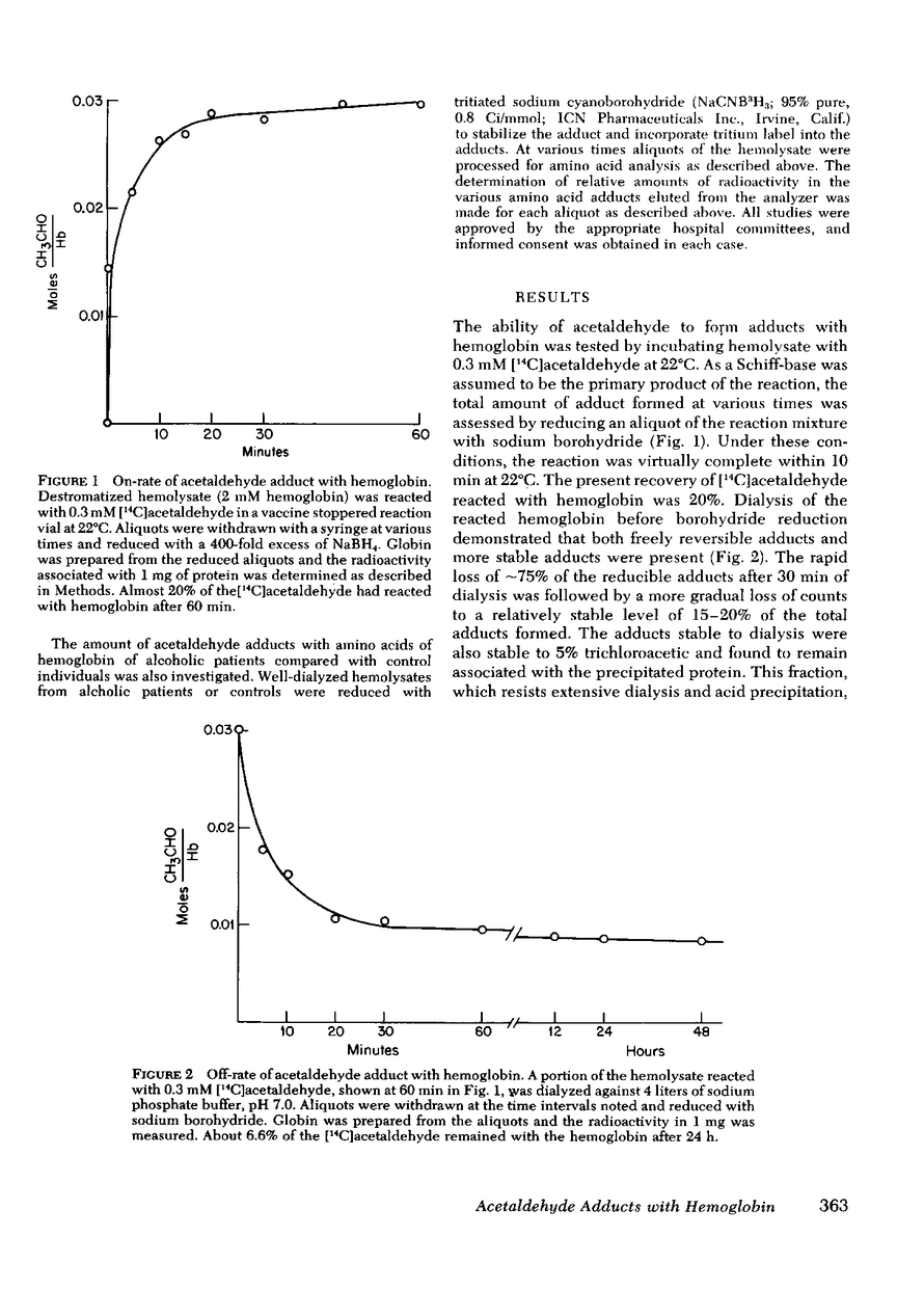 Clinical studies on the minor hemoglobins (hemoglobin A1a-c) have suggested that a novel adduct may form in people abusing alcohol. Such patients were found to have an elevated concentration of minor hemoglobins, but normal or subnormal amounts of glycosylated hemoglobin (hemoglobin A1c) as determined by radioimmunoassay, Acetaldehyde, a reactive metabolite of ethanol, was postulated to form adducts with hemoglobin A that change its chromatographic properties. At physiological concentrations, acetaldehyde was found to form adducts with hemoglobin that were stable to extensive dialysis for several days. The amount of hemoglobin adducts formed were a function of the concentration and number of exposures to acetaldehyde. The reaction of acetaldehyde with hemoglobin A produced chromatographic variants, some of which migrated in the hemoglobin A1a-c region. Analysis of stable acetaldehyde-hemoglobin adducts demonstrated that valine, lysine, and tyrosine residues of globin were sites of reaction. The acetaldehyde-modified amino acid residues appear to exist in interconvertible conformations, only one of which is reducible by sodium borohydride. The amount of these adducts was found to be significantly elevated in hemoglobin from alcoholics as compared with normal volunteers.