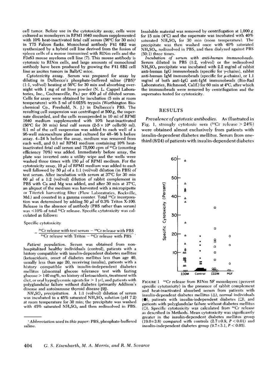 We have found complement-dependent cytotoxic antibodies in the serum of 8 of 24 patients with insulin-dependent diabetes mellitus using a 51Cr cytotoxicity assay with monolayers of cloned rat islet cells (clones RINm 5F and RINm 14B). In contrast, complement-dependent cytotoxicity with 51Cr release greater than 24% was found with sera from 34 controls or from 5 patients with polyglandular failure without diabetes, and was present in only 1 serum our of 12 from patients with insulin-independent diabetes mellitus. The prevalence of antibodies appears to decrease with duration of insulin-dependent diabetes, and in one patient studied, cytotoxic antibodies were present at the time of diagnosis of diabetes. Cytotoxicity is independent of insulin synthesis, as evidenced by the linear correlation of cytotoxicity of sera for the insulin-producing clone RINm 5F and the somatostatin-producing clone RINm 14B. The present study identifies nonspecies-specific cytotoxic antibodies in the serum of patients with diabetes mellitus, and the assay used should facilitate studies of humoral immunity in the pathogenesis of diabetes mellitus.