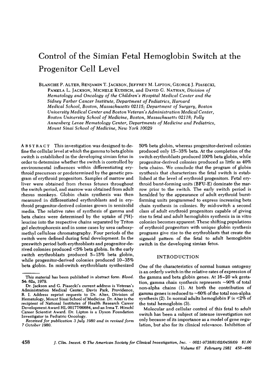 Blanche P. Alter, Benjamin T. Jackson, Jeffrey M. Lipton, George J. Piasecki, Pamela L. Jackson, Michele Kudisch, David G. Nathan