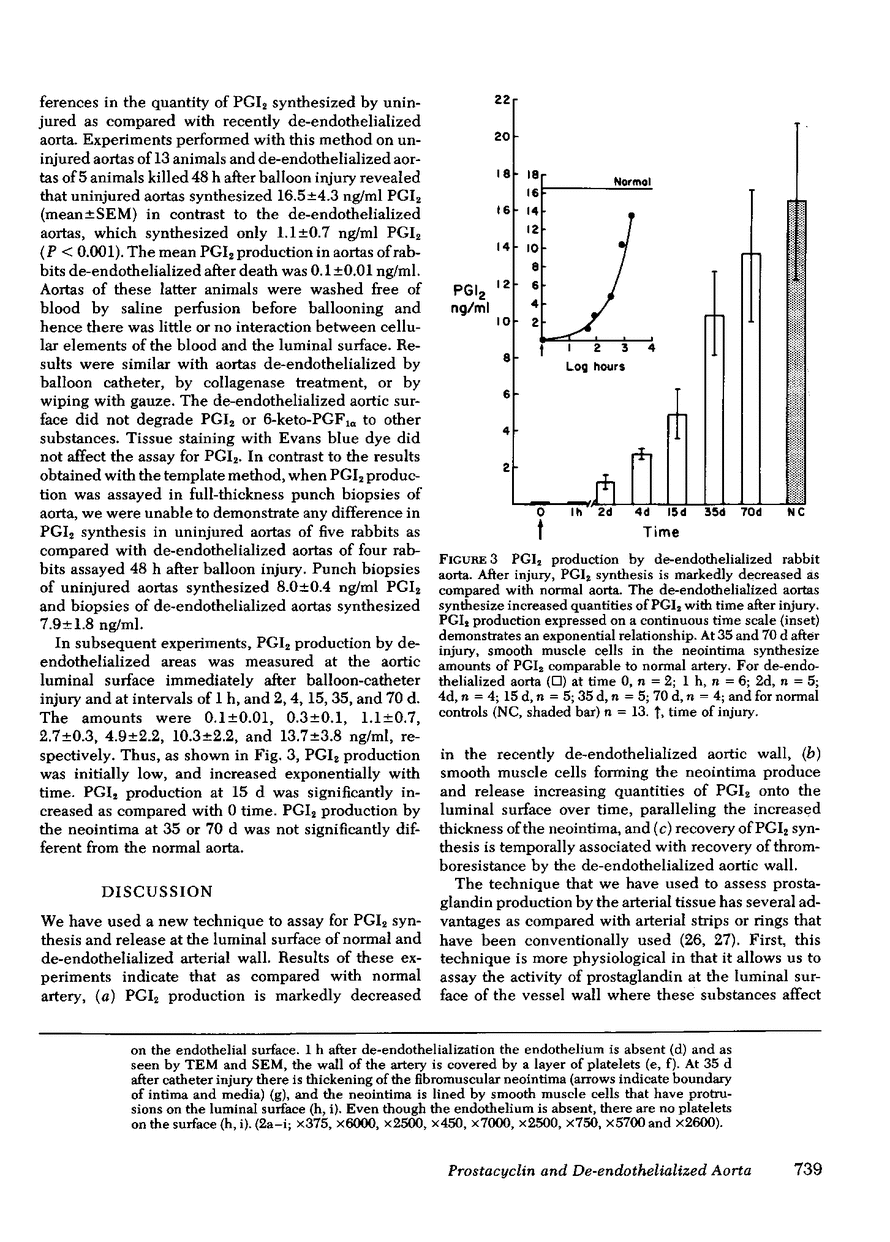 Prostacyclin (PGI2) synthetic capacity was assayed at the surface of aortas at various intervals after removal of endothelium with a balloon catheter. Results were correlated with morphologic changes in the vessel wall seen by light microscopy, scanning and transmission electron microscopy. To assay PGI2 synthetic capacity, we applied an incubation chamber to the luminal surface of the aortas; after arachidonic acid stimulation we assayed the PGI2 synthesized with a bioassay and radioimmunoassay. PGI2 synthesis in de-endothelialized aortas was determined immediately after balloon-catheter injury and at intervals of 1 h and 2, 4, 15, 35, and 70 d. PGI2 synthesis was low at 1 h and increased over time with levels at 35 and 70 d reaching that of normal artery. Scanning and transmission electron microscopy of de-endothelialized areas showed persistent absence of endothelium with formation of a neointima composed of smooth muscle cells. De-endothelialized aorta was covered with adherent platelets shortly after injury, however several days later only a few platelets adhered to the denuded surface. Results indicated that (a) endothelium is responsible for nearly all PGI2 production at the luminal surface of the normal aorta, (b) de-endothelialized muscular neointima synthesized increasing quantities of PGI2 with time after injury, and (c) increase of PGI2 production at the luminal surface of de-endothelialized aorta correlates with formation of a neointima and with the acquired thromboresistance of the aorta.
