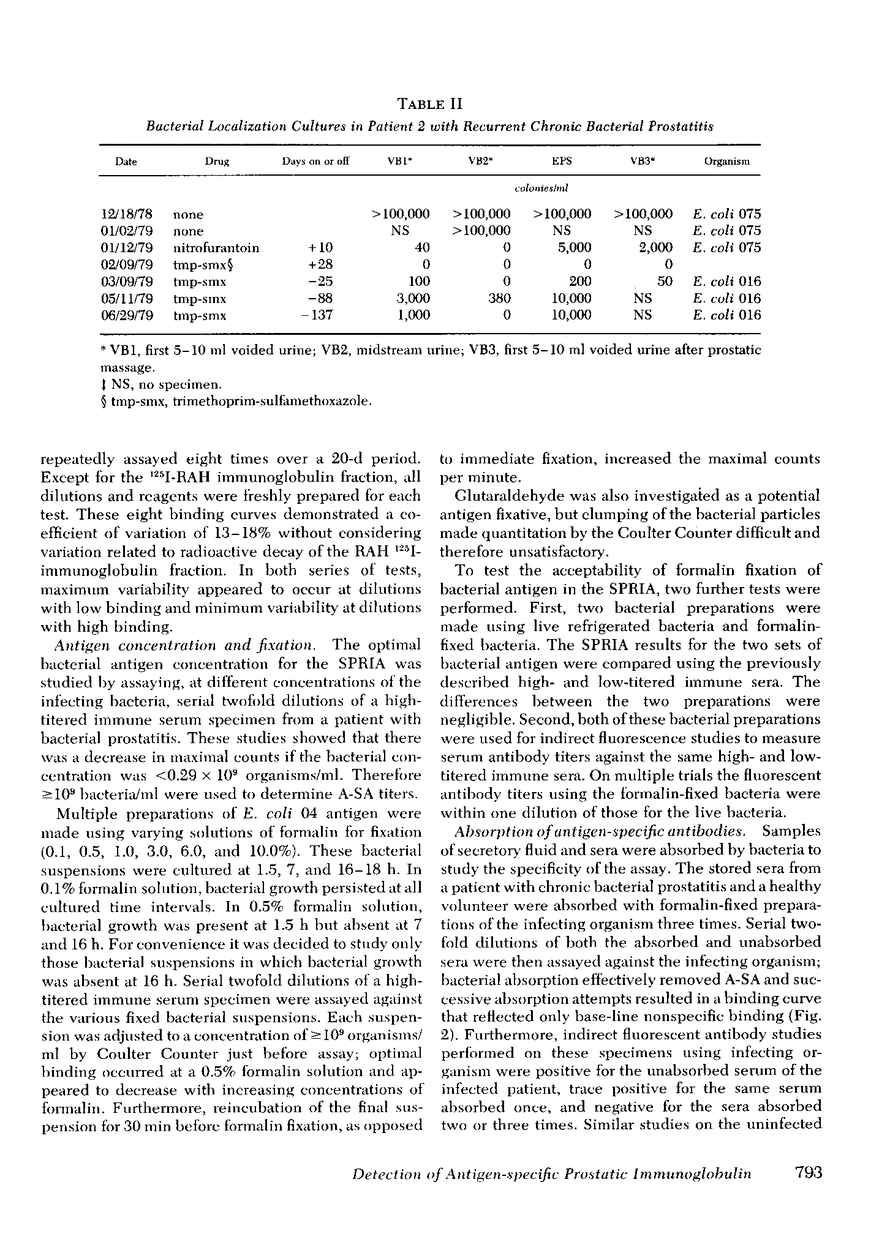 The prostatic fluid of two patients with Escherichia coli bacterial prostatitis was analyzed for evidence of a local immune response to bacterial infection. A solid-phase radioimmunoassay was modified to measure the immunoglobulin (Ig)A and IgG antigen-specific antibody responses to infecting bacteria in serum and prostatic fluid from patient. Formalin-fixed whole E. coli were used as antigen. In one patient with acute E. coli prostatic infection, measurements of antigen-specific antibody confirm the presence of a systemic and local immune response. However, in another patient with a chronic E. coli prostatitis, a primarily local immune response was demonstrated. The response measured in the prostatic fluid appears to be locally stimulated and specific for the infecting bacteria. Furthermore, IgA was the predominant immunoglobulin involved in the local prostatic immune response to infection. Although elevations of serum IgA antigen-specific antibody levels were short-liver after treatment of prostatic infection, local IgA antigen-specific antibodies were detected for as long as 1 yr after the initial infection in both patients studied.