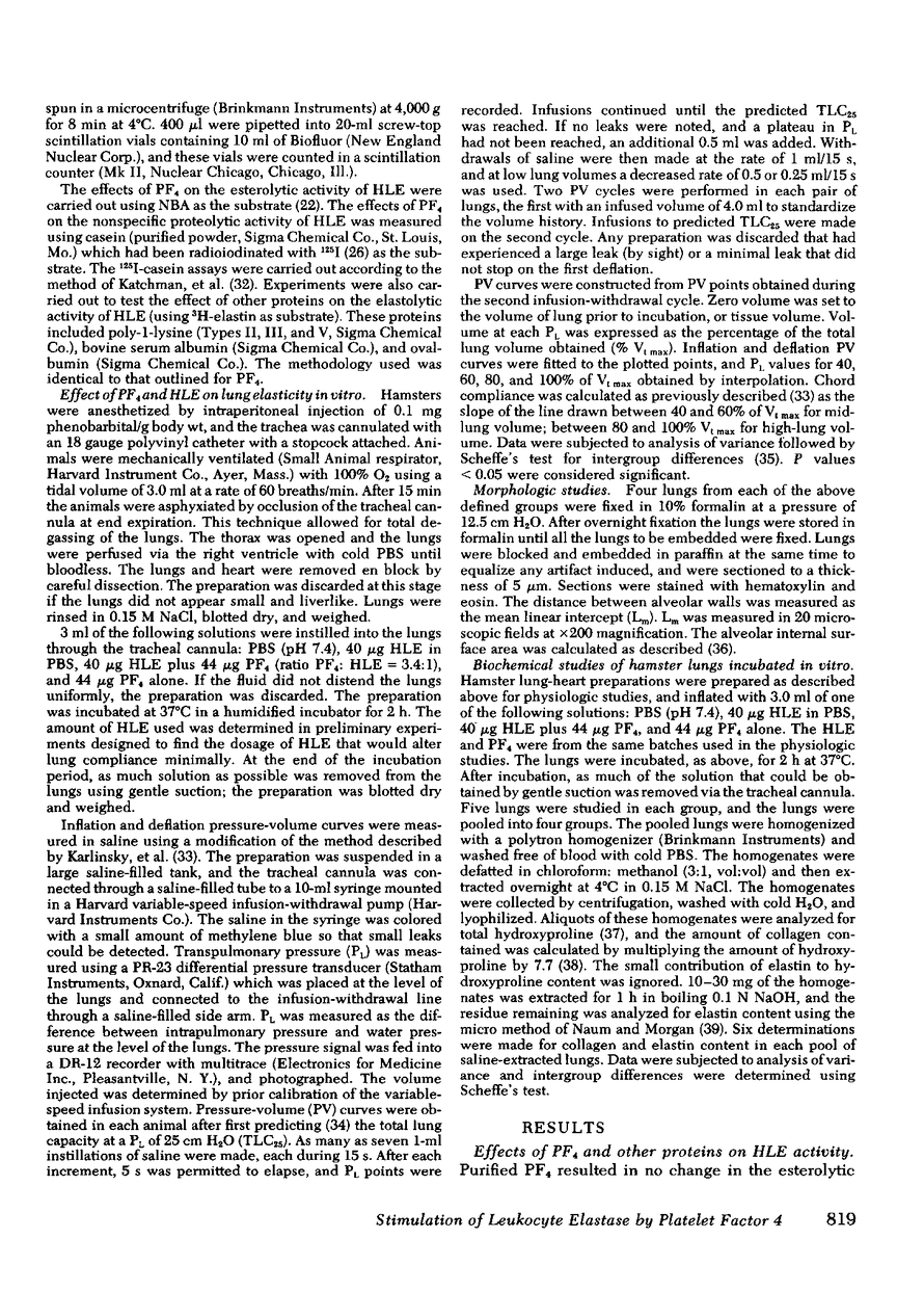The purpose of this study was to determine if human platelet factor 4 (PF4) stimulates human leukocyte elastase (HLE) against lung elastin. Lung elastin was purified from hamster lungs and tritiated by reduction with NaB3H4. We found that HLE activity against this substrate is increased by concentrations of PF4 as low as 1.6 microgram/ml, and that this stimulation increased linearly with additional PF4. Lungs removed from hamsters and inflated with solutions containing buffer alone, low dose HLE, HLE plus PF4, or PF4 alone were incubated for 2 h at 37 degrees C. Whereas low-dose HLE failed to lower lung elastin when compared to control animals, HLE stimulated by PF4 lowered lung elastin by 20%. PF4 alone had no effect. Furthermore, low-dose HLE failed to alter the mechanical properties of hamster lungs as measured by pressure-volume curves in saline, although there was a significant loss of lung elasticity in the mid- and high-lung volume ranges in lungs treated with HLE and PF4. Morphologic studies revealed that low dose HLE resulted in a minimal emphysemalike lesion whereas HlE plus PF4 caused a significantly more severe lesion. PF4 is capable of stimulating HLE against lung elastin, and this effect may have a role in the pathogenesis of emphysema.