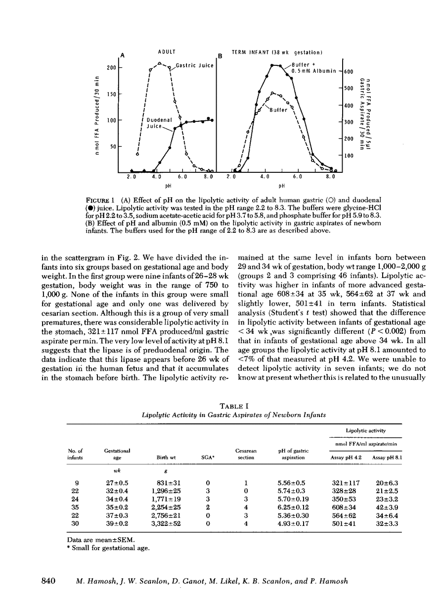 We have measured lipolytic activity in gastric aspirates obtained at birth in a group of 142 infants. The infants ranged in gestational age from 26 to 41 wk. Lipolytic activity, measured by the hydrolysis of long chain triglyceride ([tri-3H]oleate), and expressed as nanomoles FFA per milliliter gastric aspirate per minute was 333±66 in 55 small premature infants (gestational age 26-34 wk and body wt 750-2,000 g) and 558±45 in a group of 87 larger infants (gestational age 35-41 wk and body wt 2,020-4,000 g). No activity was detected in seven infants with an unusually low pH in the gastric aspirate, 2.88±0.44 (compared with a mean pH level of 5.59±0.22 in the other 135 infants).