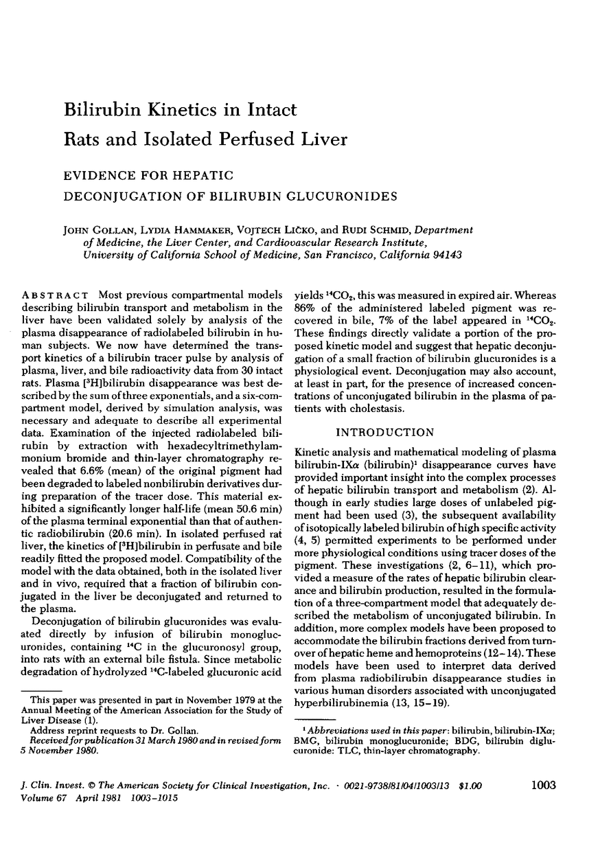 Most previous compartmental models describing bilirubin transport and metabolism in the liver have been validated solely by analysis of the plasma disappearance of radiolabeled bilirubin in human subjects. We now have determined the transport kinetics of a bilirubin tracer pulse by analysis of plasma, liver, and bile radioactivity data from 30 intact rats. Plasma [3H]bilirubin disappearance was best described by the sum of three exponentials, and a six-compartment model, derived by simulation analysis, was necessary and adequate to describe all experimental data. Examination of the injected radiolabeled bilirubin by extraction with hexadecyltrimethylammonium bromide and thin-layer chromatography revealed that 6.6% (mean) of the original pigment had been degraded to labeled nonbilirubin derivatives during preparation of the tracer dose. This material exhibited a significantly longer half-life (mean 50.6 min) of the plasma terminal exponential than that of authentic radiobilirubin (20.6 min). In isolated perfused rat liver, the kinetics of [3H]bilirubin in perfusate and bile readily fitted the proposed model. Compatibility of the model with the data obtained, both in the isolated liver and in vivo, required that a fraction of bilirubin conjugated in the liver be deconjugated and returned to the plasma. Deconjugation of bilirubin glucuronides was evaluated directly by infusion of bilirubin monoglucuronides, containing 14C in the glucuronosyl group, into rats with an external bile fistula. Since metabolic degradation of hydrolyzed 14C-labeled glucuronic acid yields 14CO2, this was measured in expired air. Whereas 86% of the administered labeled pigment was recovered in bile, 7% of the label appeared in 14CO2. These findings directly validate a portion of the proposed kinetic model and suggest that hepatic deconjugation of a small fraction of bilirubin glucuronides is a physiological event. Deconjugation may also account, at least in part, for the presence of increased concentrations of unconjugated bilirubin in the plasma of patients with cholestasis.