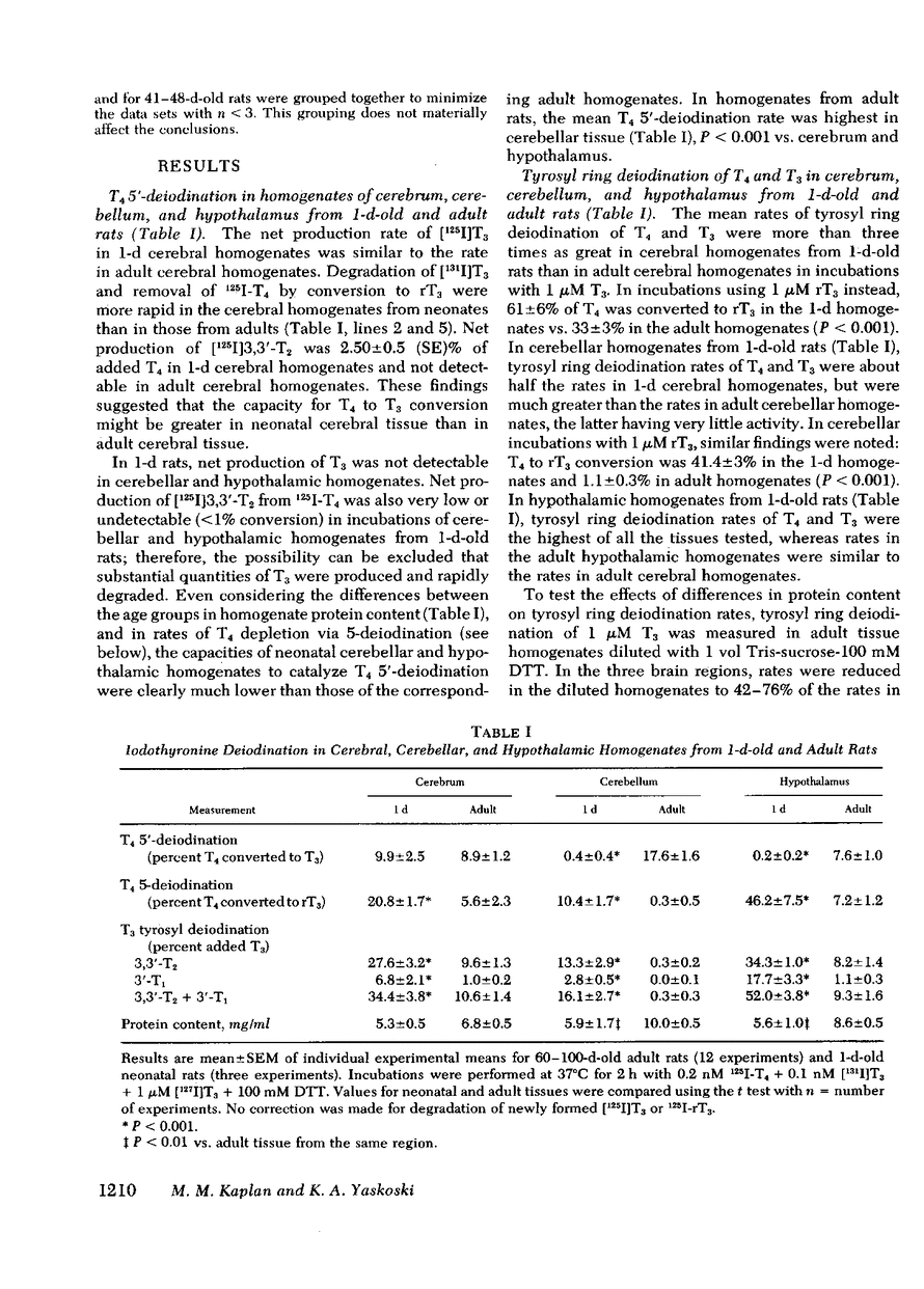 To explore the control of thyroid hormone metabolism in brain during maturation, we have measured iodothyronine deiodination in homogenates of rat cerebrum, cerebellum, and hypothalamus from 1 d postnatally through adulthood. Homogenates were incubated with 125I-l-thyroxine (T4) + [131I]3,5,3′-l-triiodothyronine (T3) + 100 mM dithiothreitol. Nonradioactive T4, T3, and 3,3′,5′-triiodothyronine (rT3) were included, as appropriate. The net production rate of [125I]T3 from T4 in 1-d cerebral homogenates was similar to the rate in adult cerebral homogenates (9.9±2.5[SEM]% vs. 8.9±1.2% T4 to T3 conversion in 2 h). Production of T3 was not detectable in 1-d cerebellar and hypothalamic homogenates. The net T3 production rate in adult cerebellar homogenates was twice as great as, and that in adult hypothalamic homogenates similar to, the rate in cerebral homogenates.