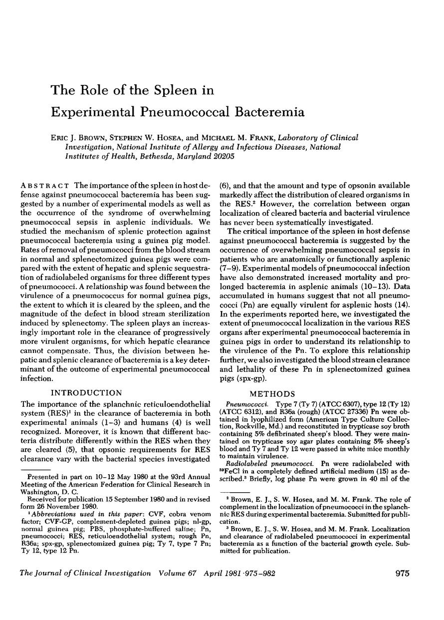 The importance of the spleen in host defense against pneumococcal bacteremia has been suggested by a number of experimental models as well as the occurrence of the syndrome of overwhelming pneumococcal sepsis in asplenic individuals. We studied the mechanism of splenic protection against pneumococcal bacteremia using a guinea pig model. Rates of removal of pneumococci from the blood stream in normal and splenectomized guinea pigs were compared with the extent of hepatic and splenic sequestration of radiolabeled organisms for three different types of pneumococci. A relationship was found between the virulence of a pneumococcus for normal guinea pigs, the extent to which it is cleared by the spleen, and the magnitude of the defect in blood stream sterilization induced by splenectomy. The spleen plays an increasingly important role in the clearance of progressively more virulent organisms, for which hepatic clearance cannot compensate. Thus, the division between hepatic and splenic clearance of bacteremia is a key determinant of the outcome of experimental pneumococcal infection.