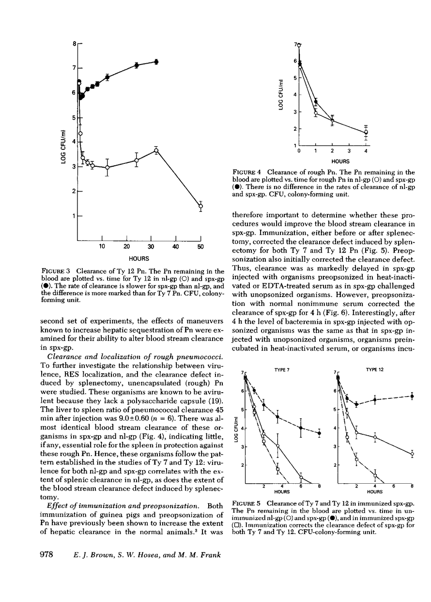 The importance of the spleen in host defense against pneumococcal bacteremia has been suggested by a number of experimental models as well as the occurrence of the syndrome of overwhelming pneumococcal sepsis in asplenic individuals. We studied the mechanism of splenic protection against pneumococcal bacteremia using a guinea pig model. Rates of removal of pneumococci from the blood stream in normal and splenectomized guinea pigs were compared with the extent of hepatic and splenic sequestration of radiolabeled organisms for three different types of pneumococci. A relationship was found between the virulence of a pneumococcus for normal guinea pigs, the extent to which it is cleared by the spleen, and the magnitude of the defect in blood stream sterilization induced by splenectomy. The spleen plays an increasingly important role in the clearance of progressively more virulent organisms, for which hepatic clearance cannot compensate. Thus, the division between hepatic and splenic clearance of bacteremia is a key determinant of the outcome of experimental pneumococcal infection.